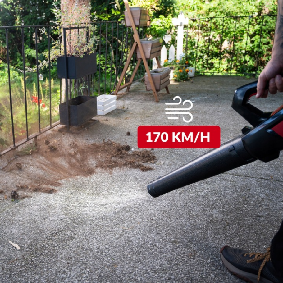 - Výkon 492 m³/h a 24 000 ot/min– umožňují získat silný proud vzduchu, který si poradí s mokrými listy, pískem nebo trávou. Ideální do zahrady a na příjezdovou cestu.