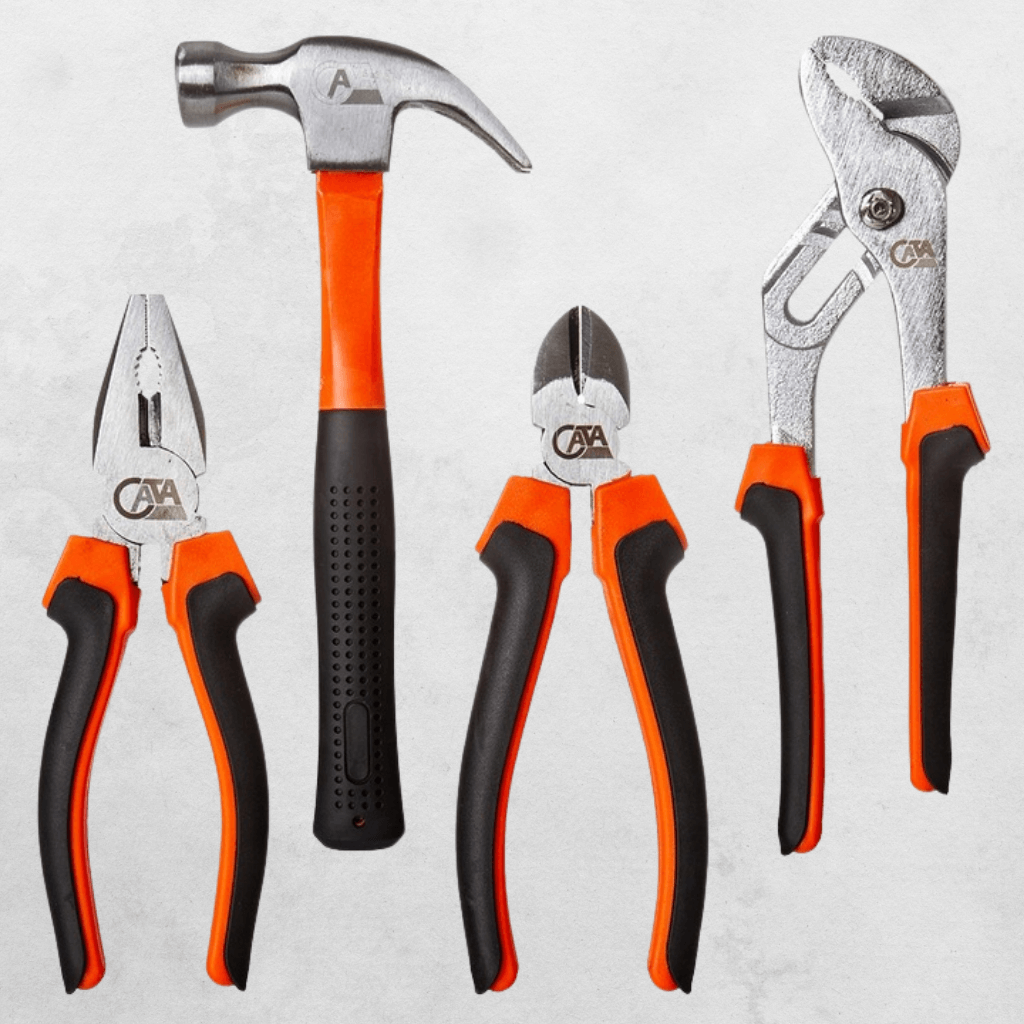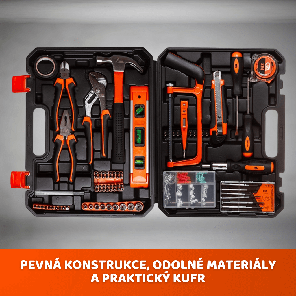 - Široká škála nástrojů: ráčna 1/4", nástrčné hlavice, šroubováky, bity, kleště, imbusy, kladivo, nůž, mini pila, vodováha, svinovací metr a další