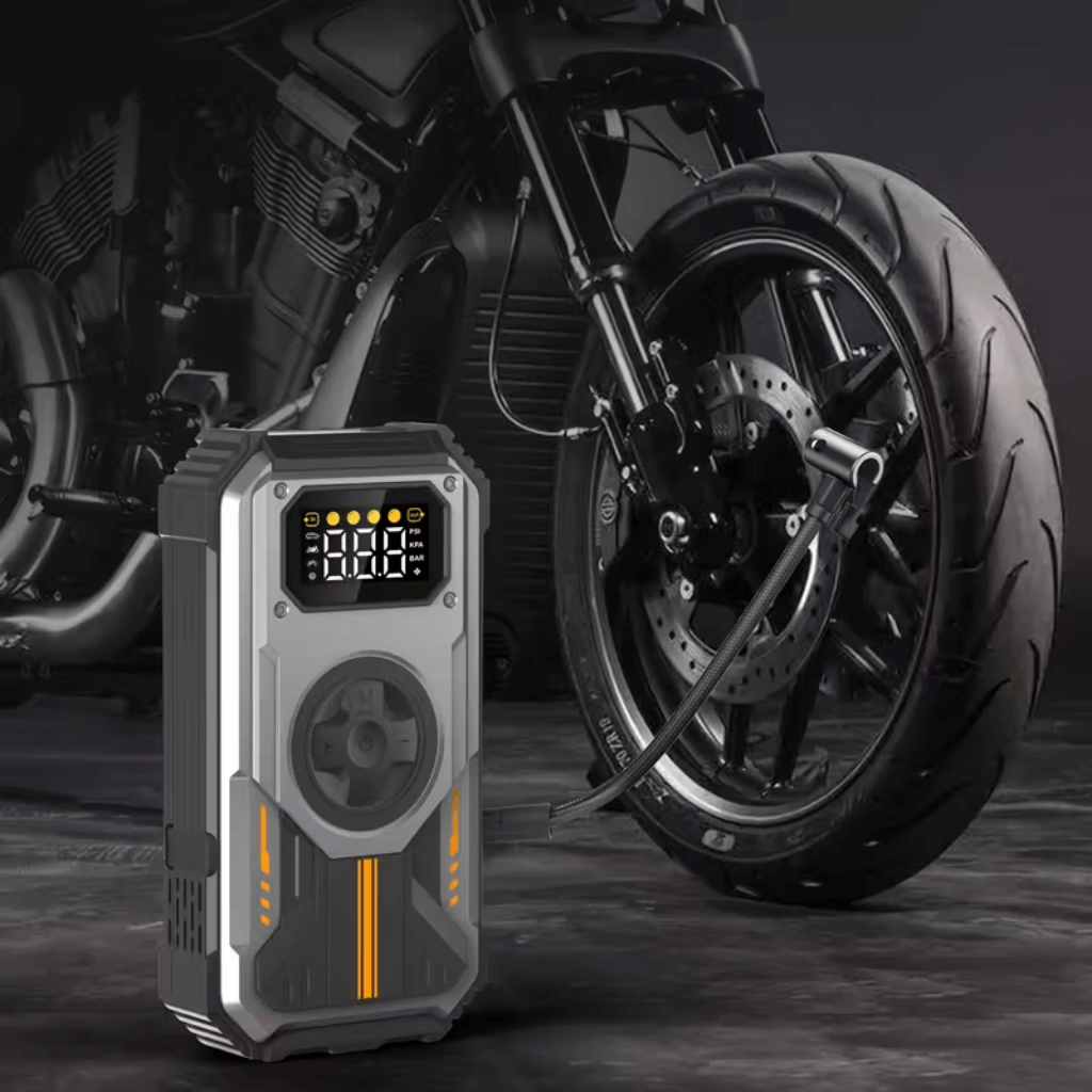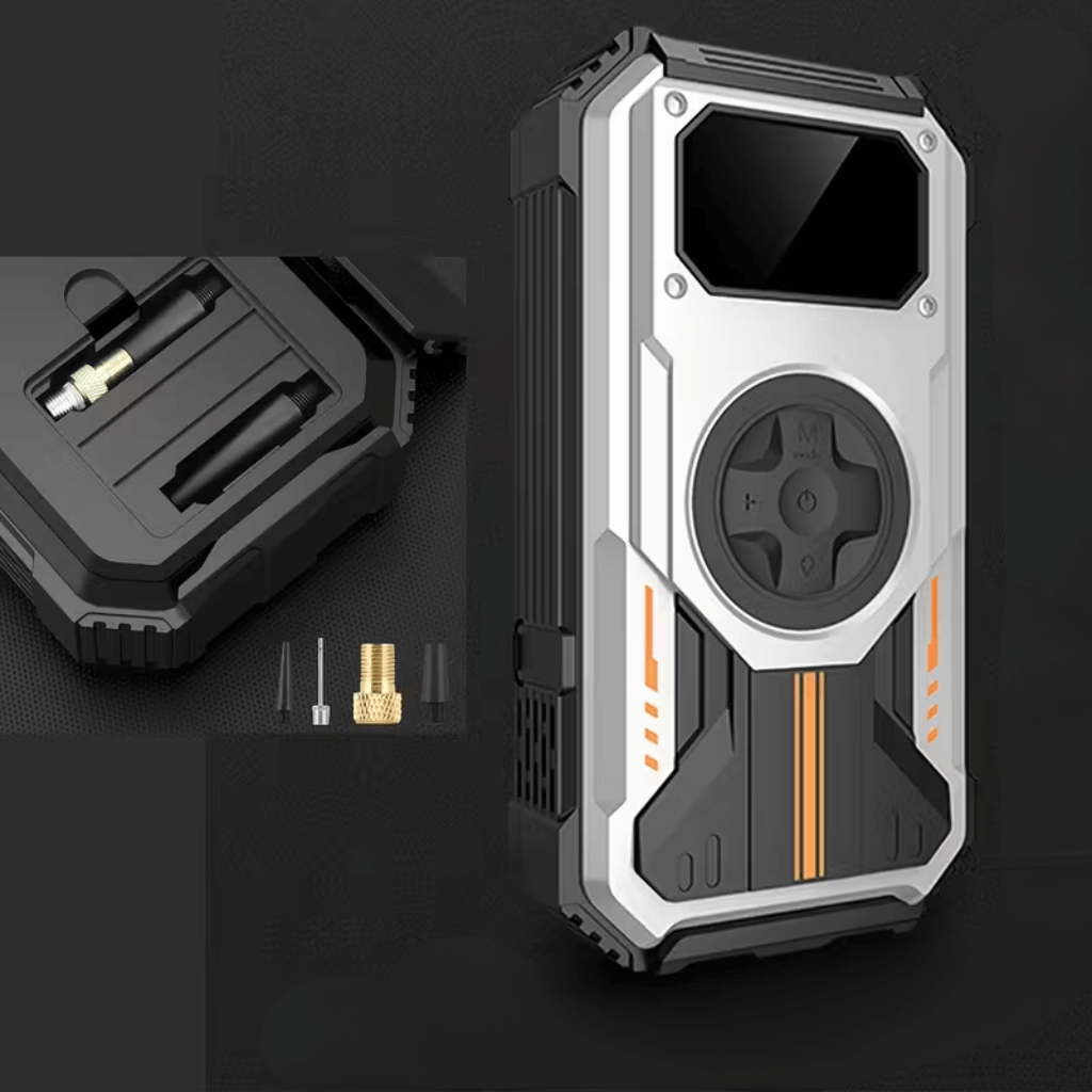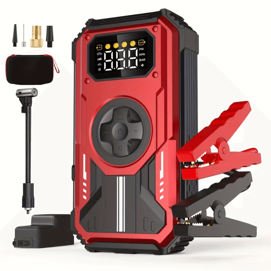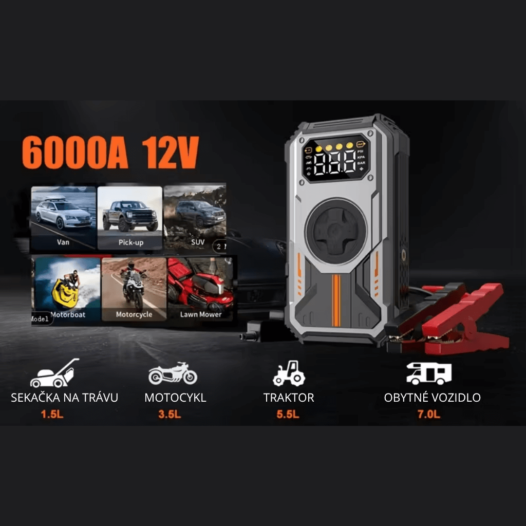 Tento přenosný startér 5v1 kombinuje pět klíčových funkcí do jediného zařízení – nouzové startování, kompresor, měření tlaku, LED osvětlení a powerbanku.