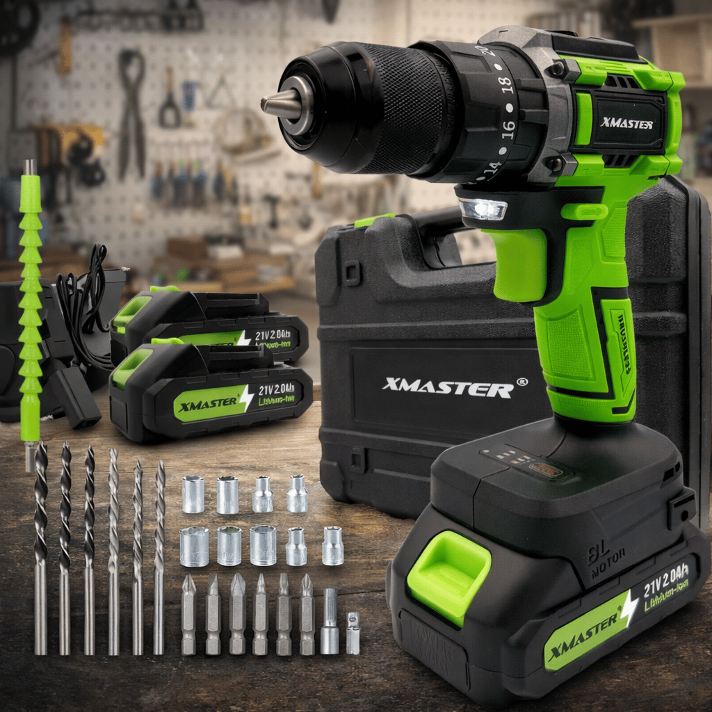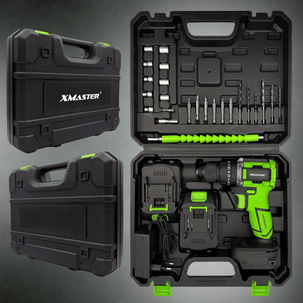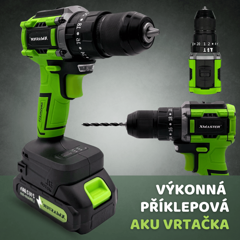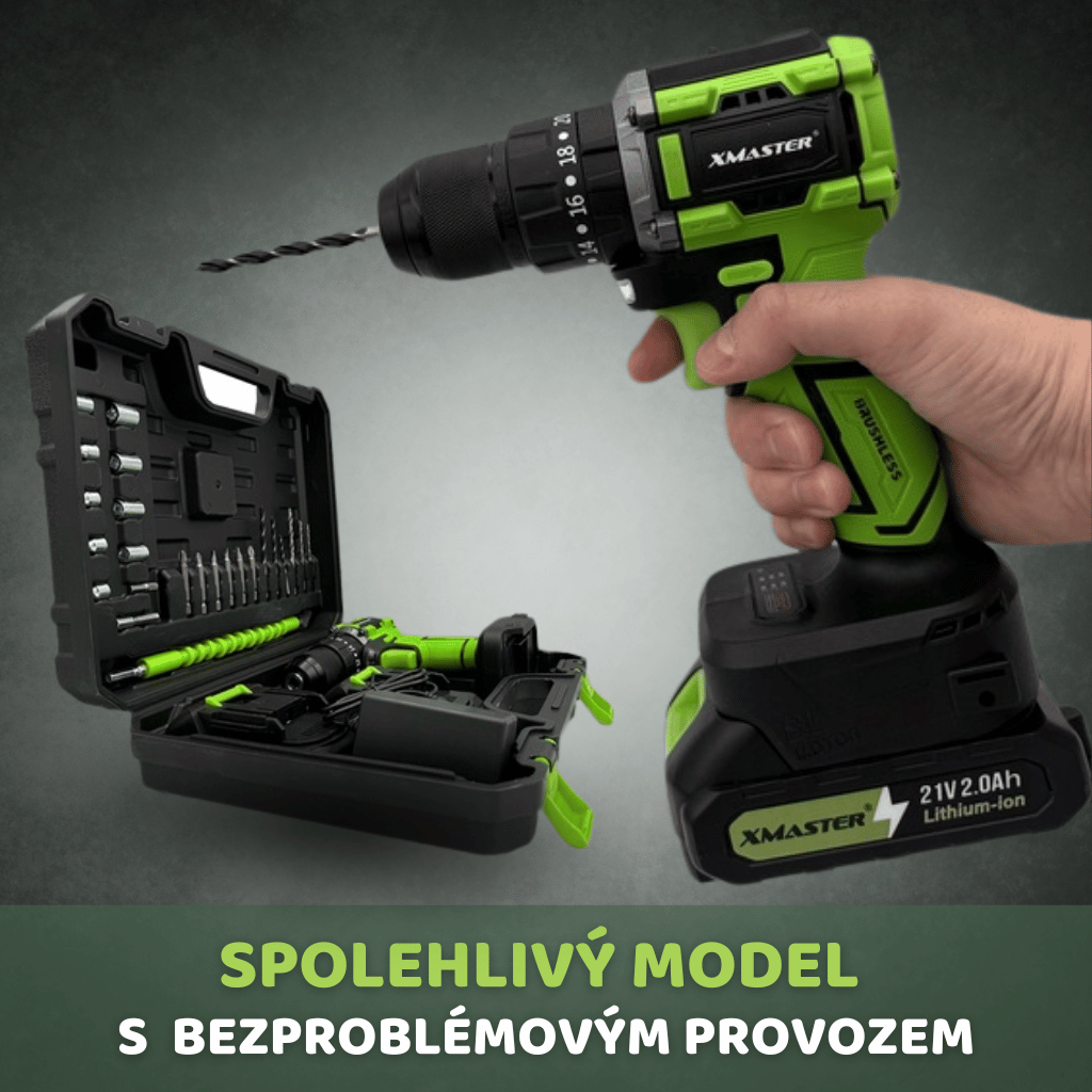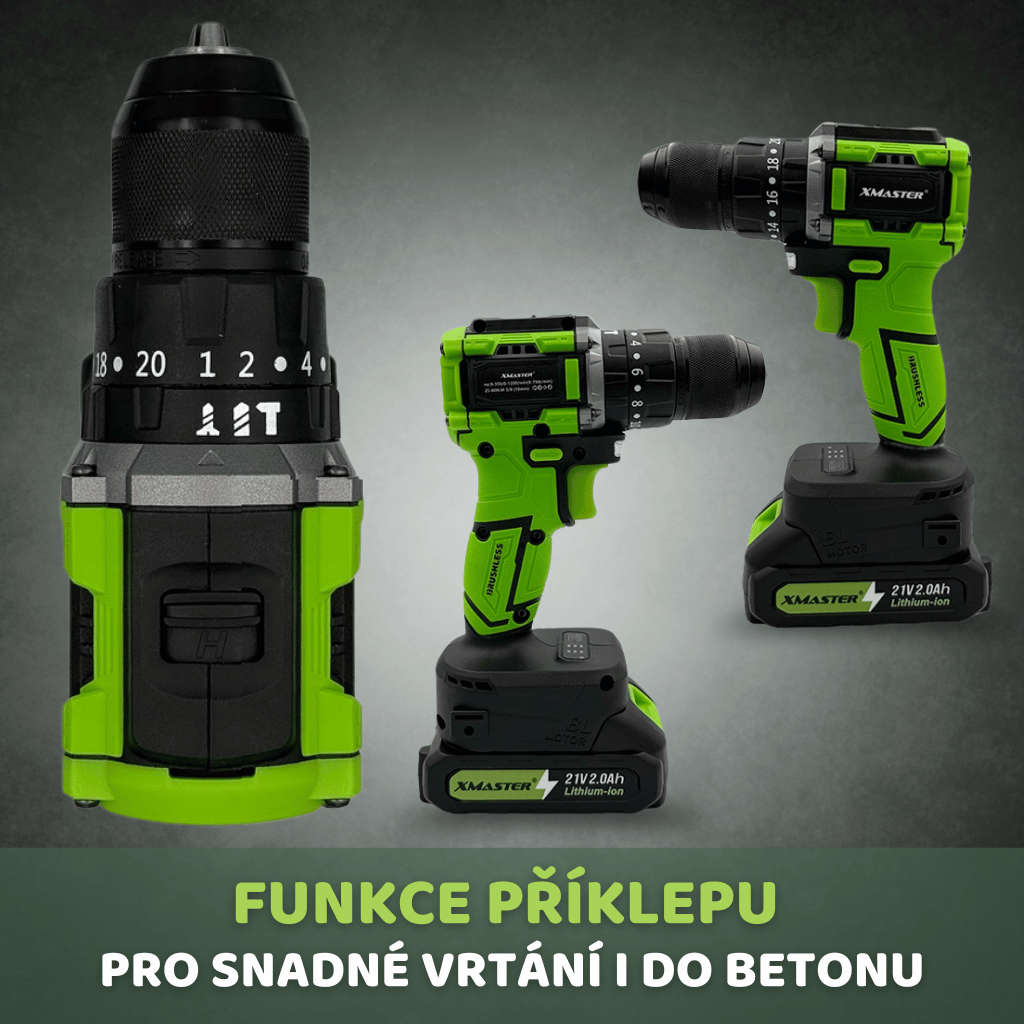 HammerDrill 21V Brushless – aku vrtačka s příklepem, bezkartáčovým motorem, kompletní sadou a 2x21V Li-Ion