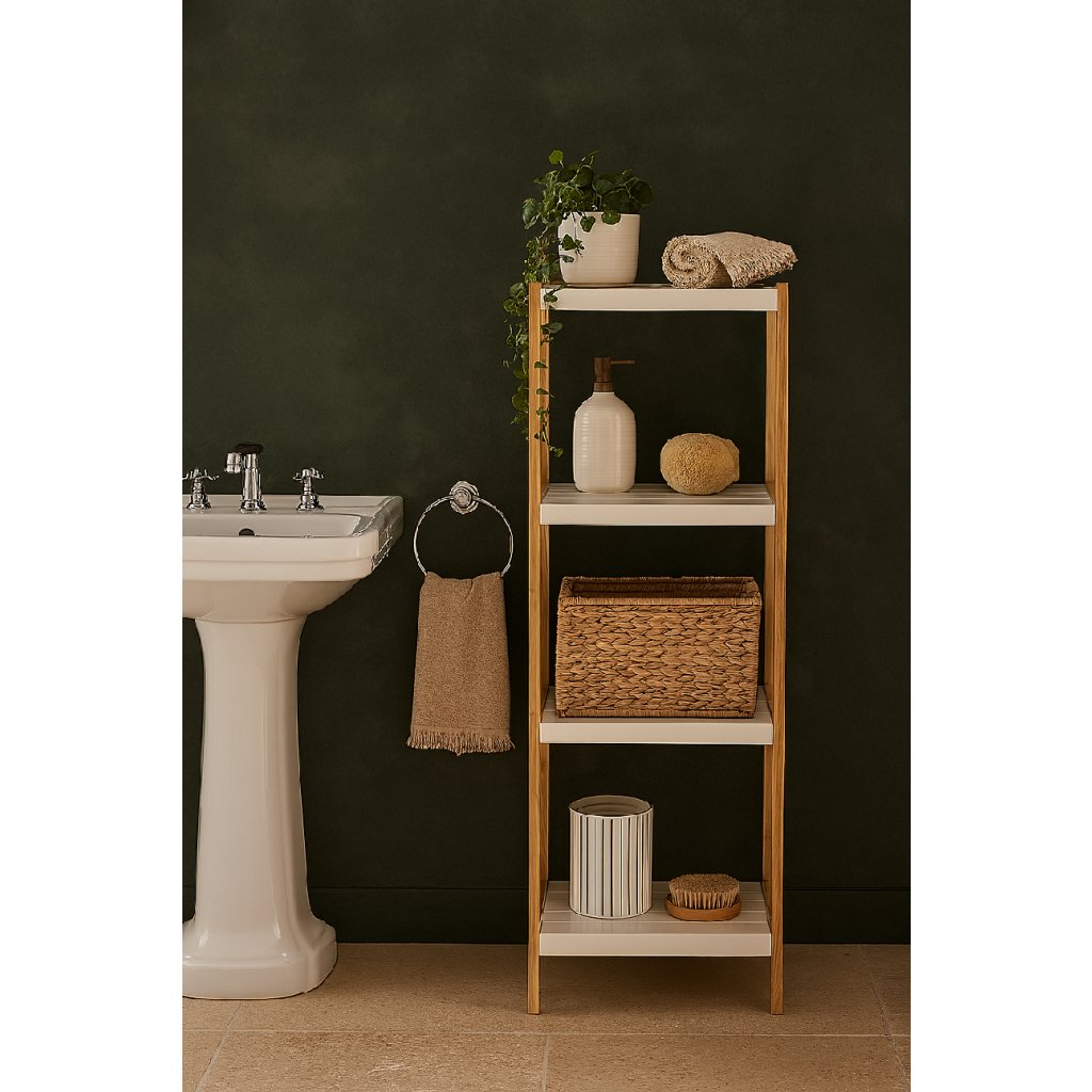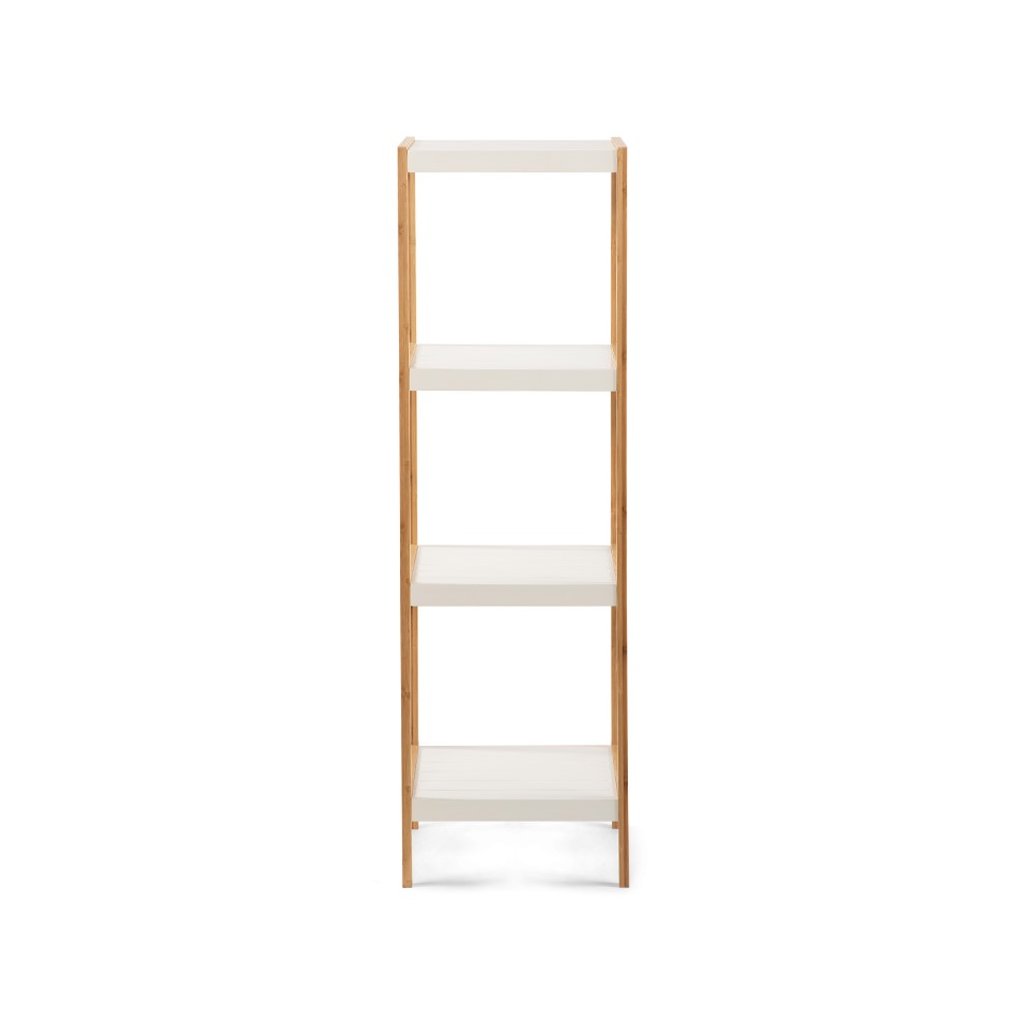 Moderní policový díl se čtyřmi úložnými policemi. Kombinace přírodního bambusového rámu a bílých polic působí elegantně a vzdušně. Stabilní konstrukce vhodná pro každodenní používání. Praktické využití pro uložení ručníků, kosmetiky, knih nebo dekorací. Hodí se do koupelny, ložnice, obývacího pokoje i předsíně. Jednoduchý design, který snadno zapadne do různých interiérů.