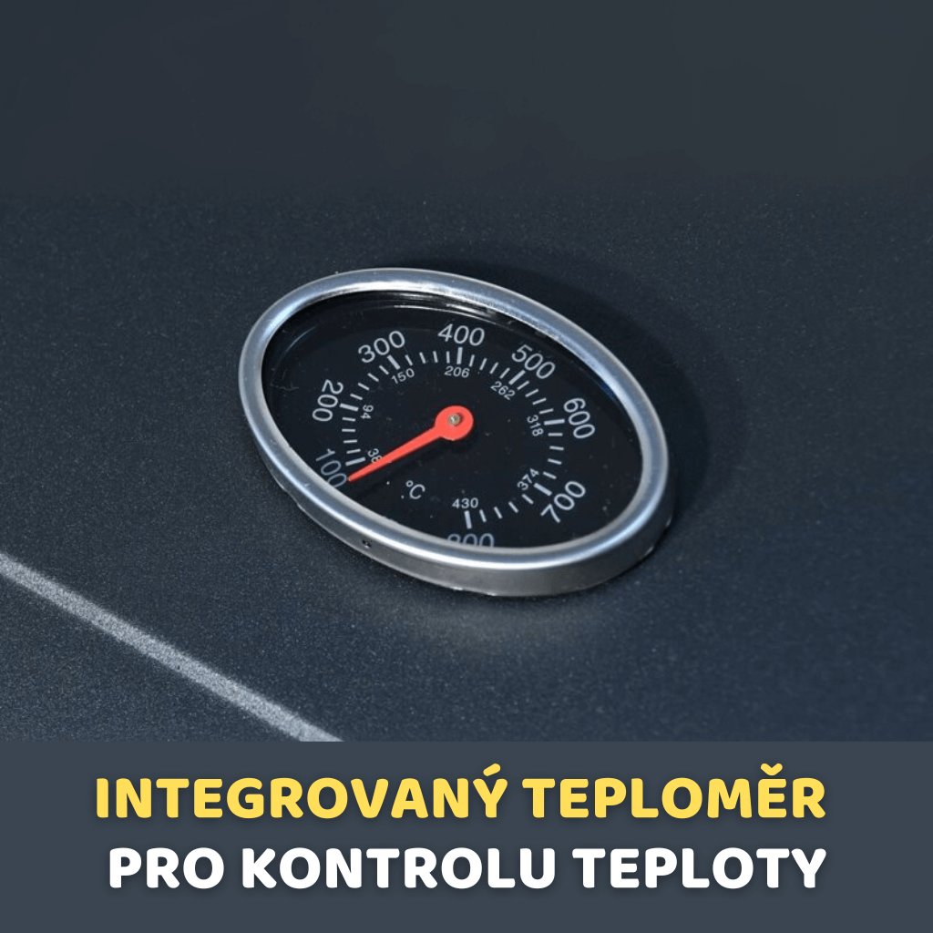 Teplotu uvnitř grilu lze snadno zkontrolovat teploměrem na víku. Teplotu můžete také regulovat odklopením víka.