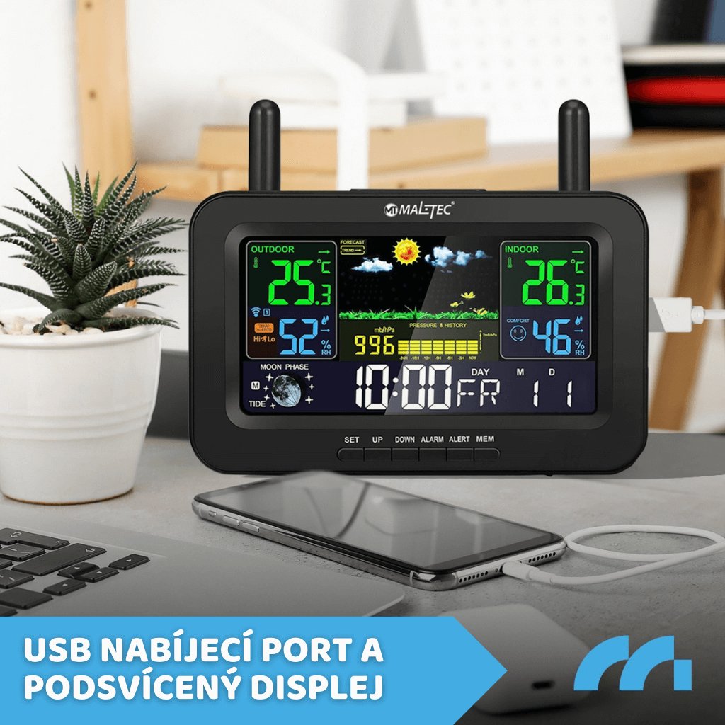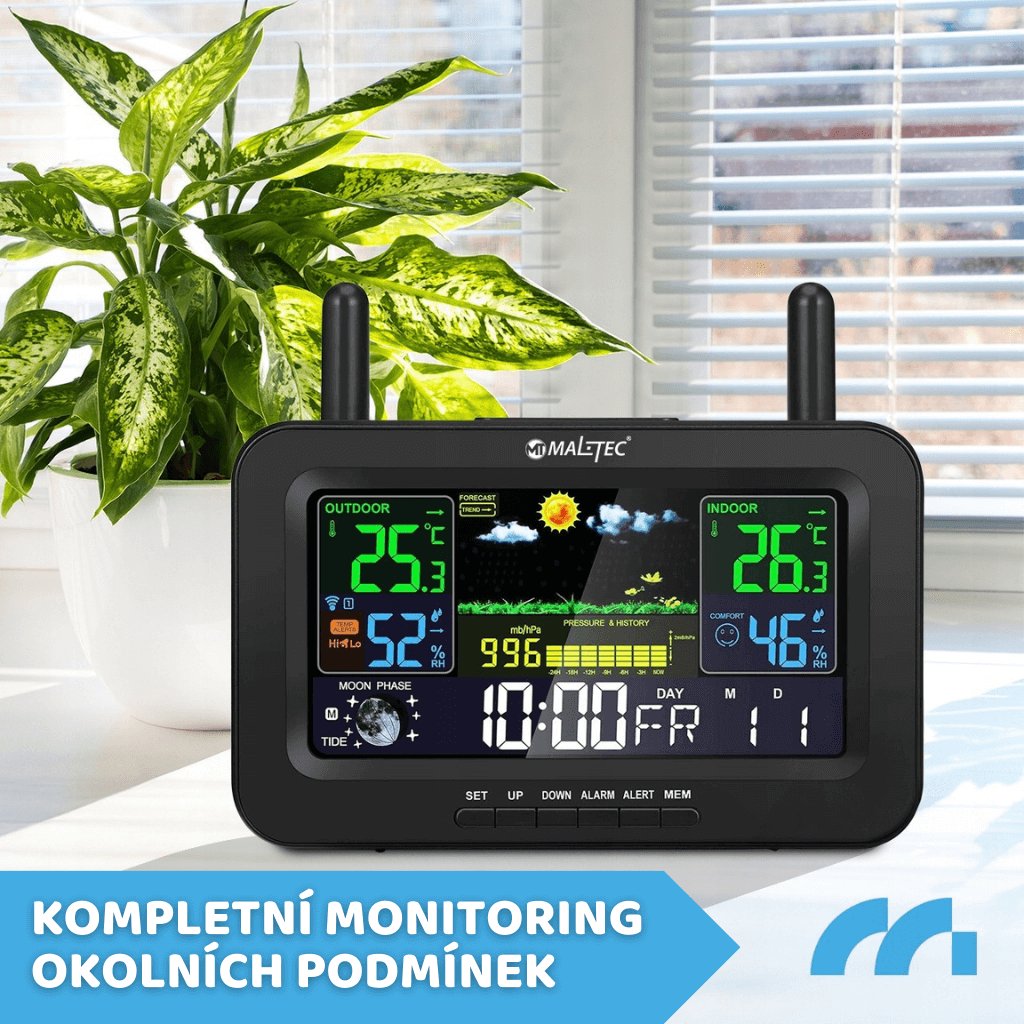 Stanice je vybavena bezdrátovým venkovním senzorem, který lze umístit kamkoli – dosahuje až 100 m, což zajišťuje aktuální a přesná data.