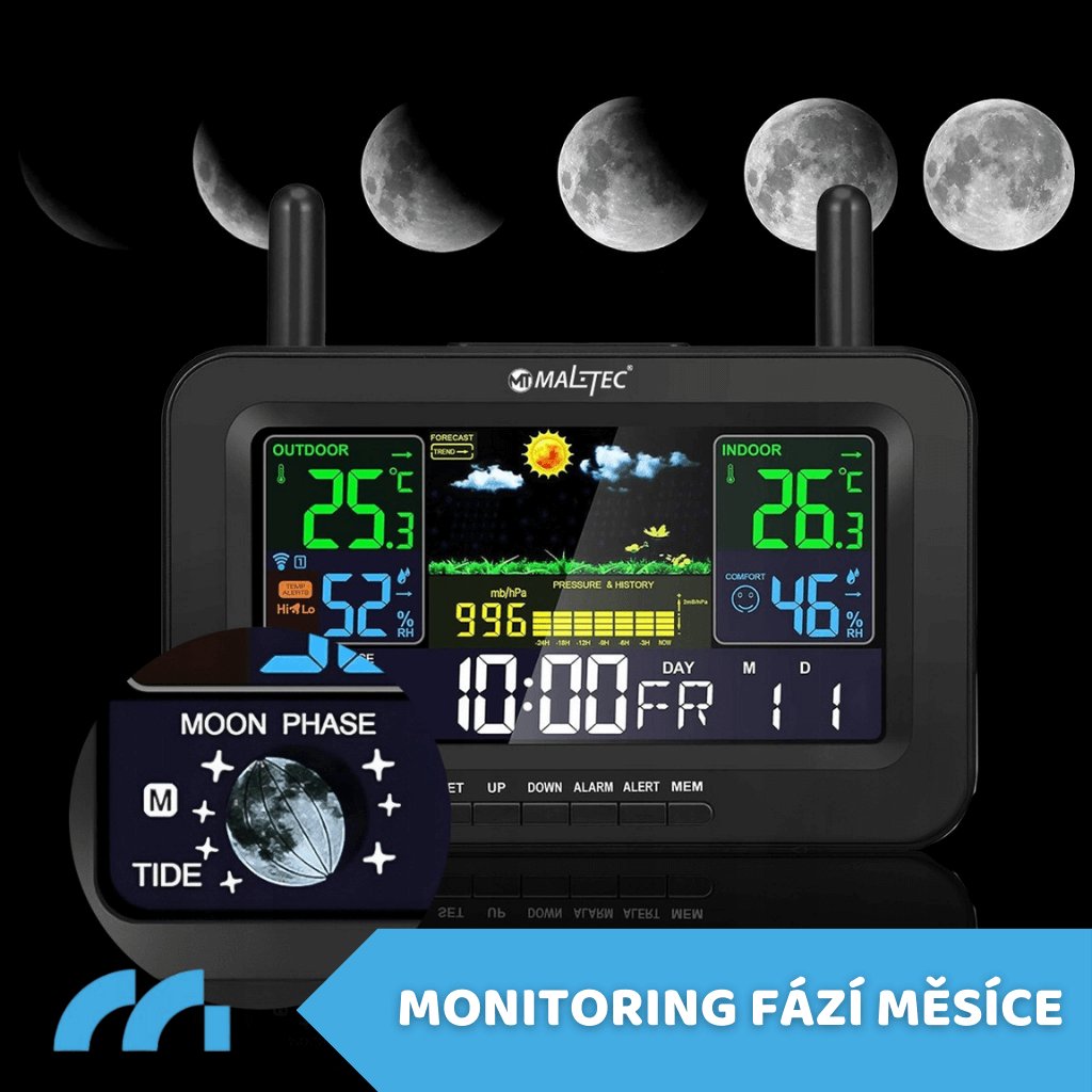Zařízení také sleduje fáze měsíce, což je užitečné pro ty, kteří plánují outdoorové aktivity – jako je rybaření nebo pozorování noční oblohy.