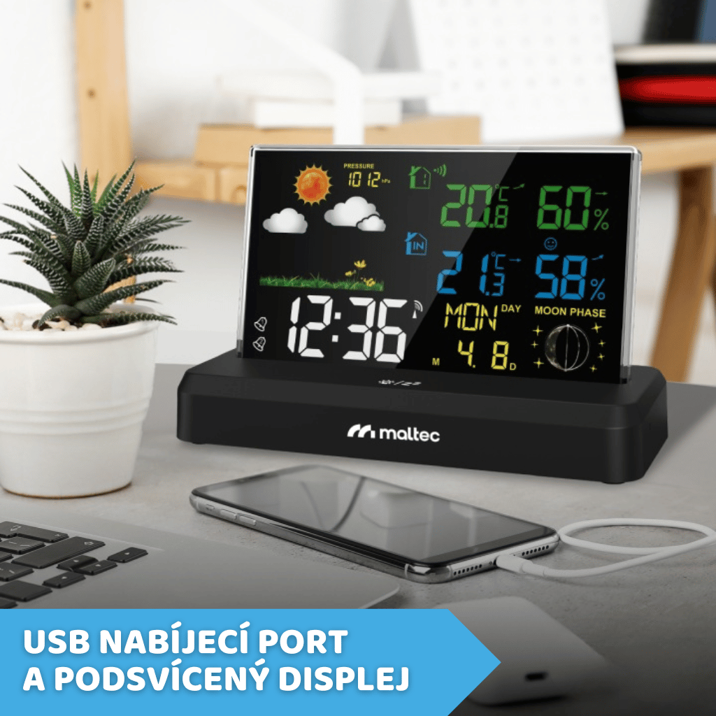 Sledujte teplotu, vlhkost, atmosférický tlak i vývoj počasí na velkém a dobře čitelném displeji.