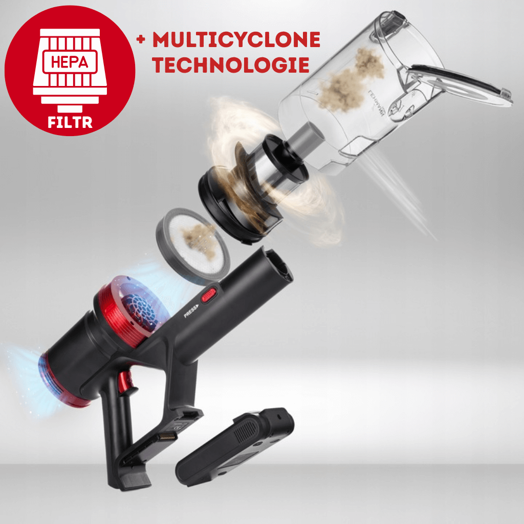 HEPA filtr zadržuje prach a alergeny, a technologie MultiCyclone lépe odděluje nečistoty bez nutnosti použití sáčků.