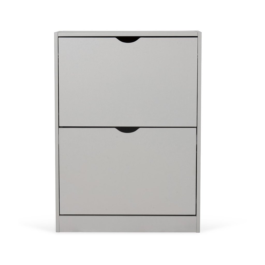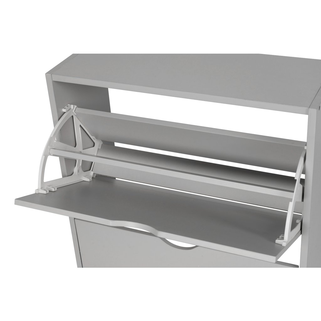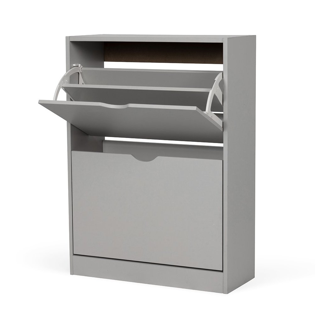 Botník s kompaktním a úzkým designem bude ideální do menších prostor. Botník z překližky nabízí dva výklopné úložné prostory pro obuv. Přihrádky na boty otevřete jednoduše pomocí výřezů místo úchytek. Stabilní konstrukce v šedé barvě určená pro každodenní používání. Moderní a minimalistický vzhled bude vhodný do předsíně či chodby.