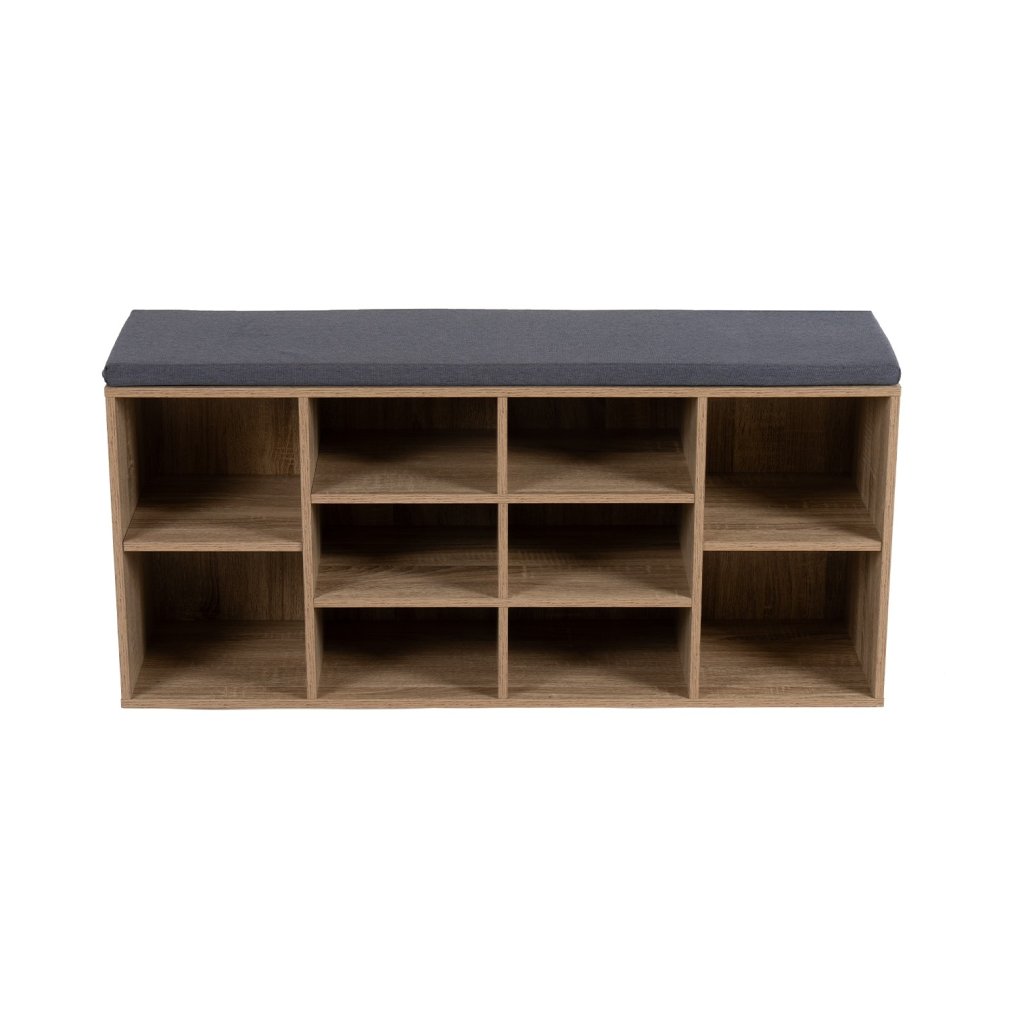 Praktický botník disponuje polstrovaným sedákem v šedé barvě pro pohodlné obouvání. Do prostorných přihrádek uložíte obuv a doplňky. Otevřený design umožňuje snadný přístup a dobré větrání bot. Stabilní a odolná konstrukce z MDF v přírodní barvě je určena pro každodenní používání. Vhodný do předsíně či chodby, kombinuje funkci úložného prostoru a lavice.