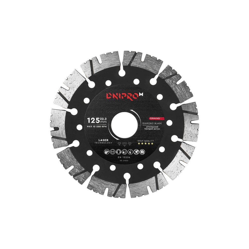 Diamantový kotouč Dnipro-M Grand je určen pro použití s úhlovou bruskou. Má zvýšenou účinnost a rychlost při práci s tvrdým železobetonem a používá se také pro práci s cihlami, žulou, kamenem a dalšími materiály.