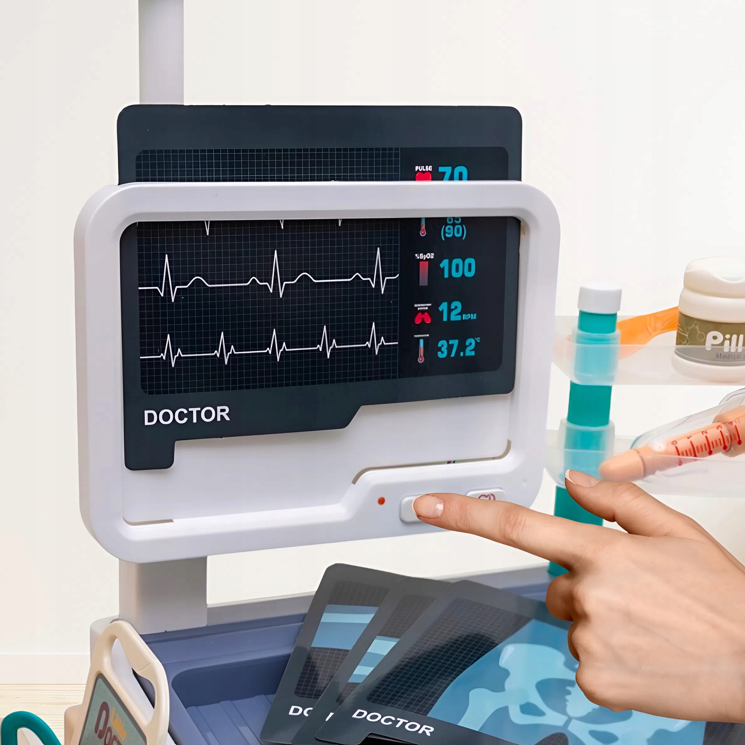 ➡ MONITOR S EKG OBRAZOVKOU – hrací displej simuluje skutečné testování srdečního tepu a tlaku, což dodává zábavě autentičnost.