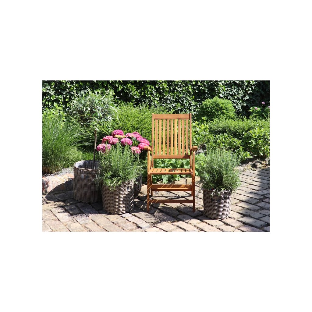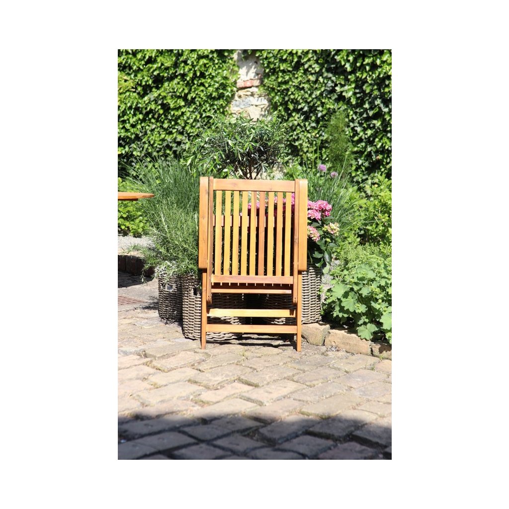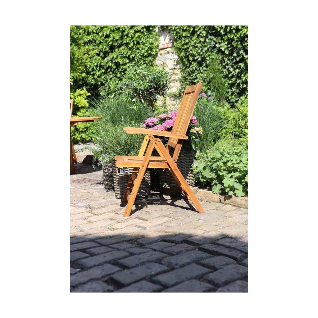 Polohovací a skládací židle Viet s područkami vyrobená z odolného akáciového dřeva. Díky atraktivnímu designu snadno esteticky zapadne do jakékoliv zahrady či terasy. Ve složeném stavu židli jednoduše uskladníte. Nosnost činí až 100 kg.