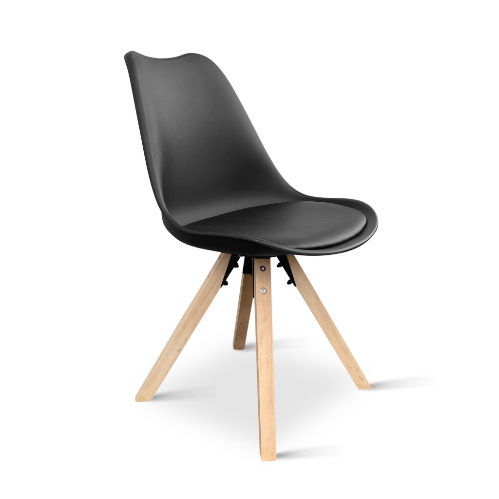 Jídelní stůl doplňuje 6 černých židlí v jednoduchém skandinávském designu. Sedák a opěrku tvoří odolná plastová skořepina připevněná na 4 nohách z masivního bukového dřeva, které dávají židli patřičnou stabilitu. Pohodlná díky sedáku z eko kůže.