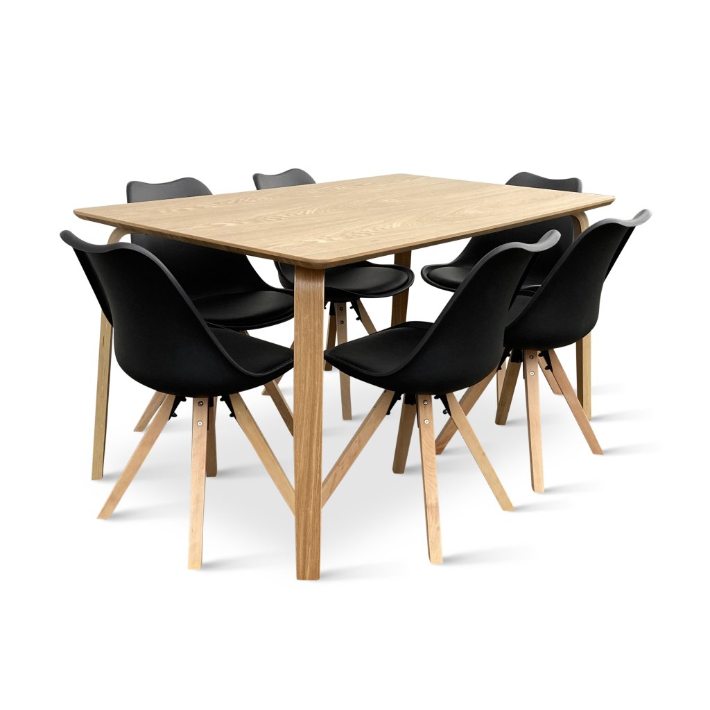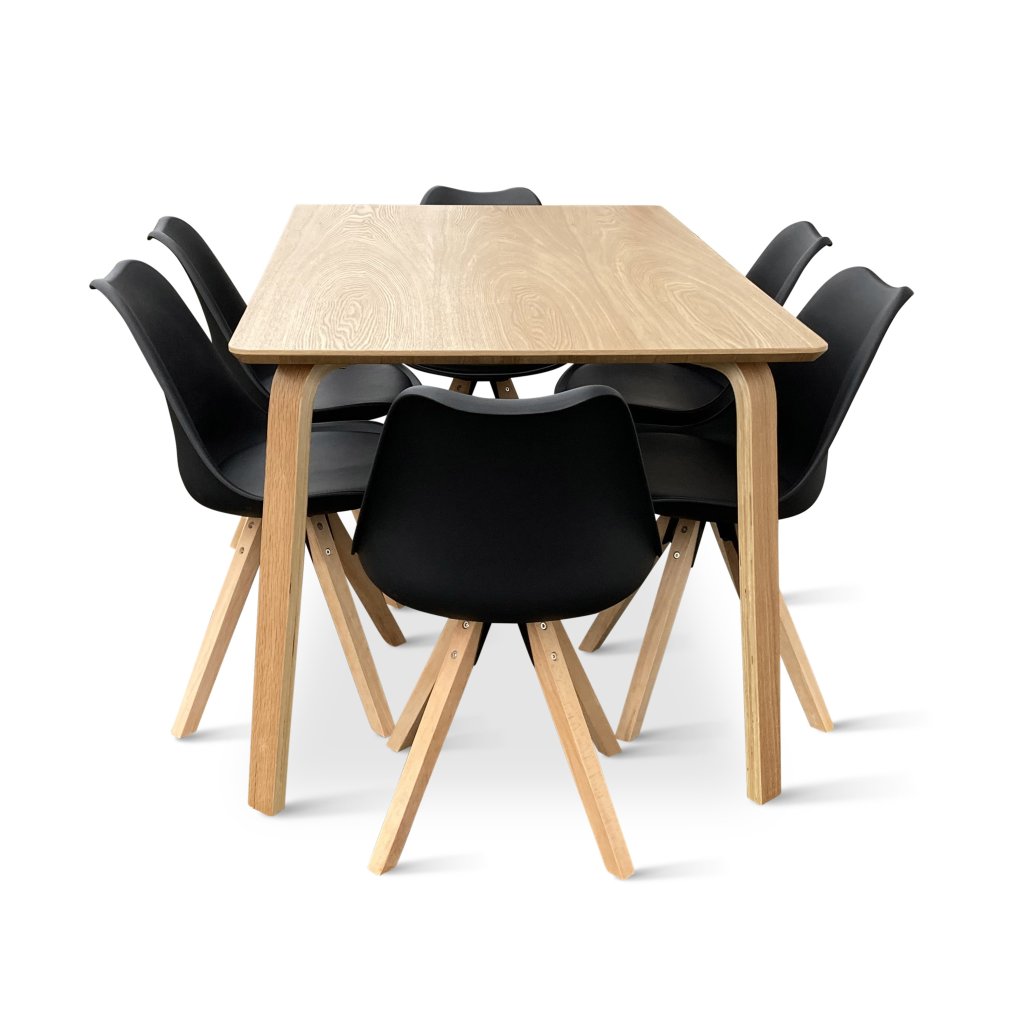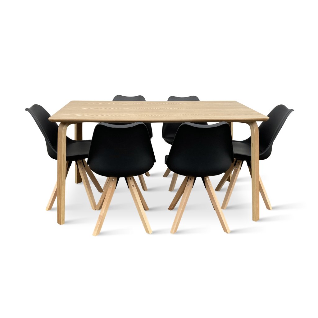 Jídelní set tvoří Dřevěný jídelní stůl Zaha v dekoru dubu 150x90 cm a 6x Jídelní židle Gina černá.