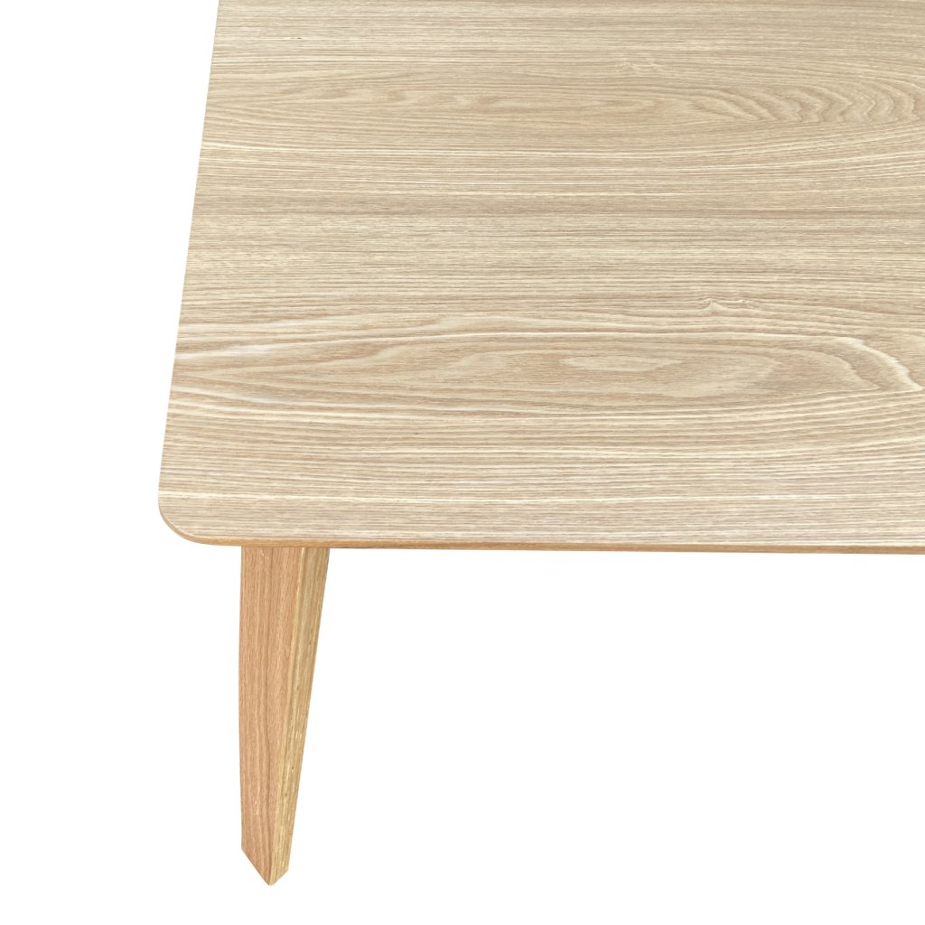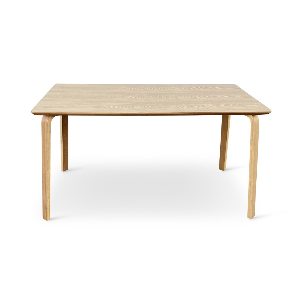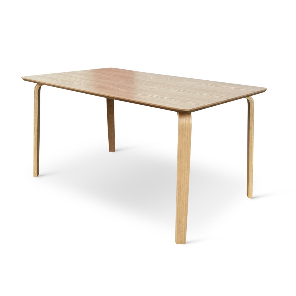 Obdélníkový jídelní stůl o rozměrech 150 x 90 cm vhodný až pro 6 osob. Deska stolu byla vyrobena z dřevovláknité desky potažené dýhou v dekoru dubu. Jedná se o cenově dostupnější materiál, který svým vzhledem imituje masivní dřevo. Moderní vzhled stolu umocňují zahnuté nohy z masivního dubu připevněné ke spodní straně desky.