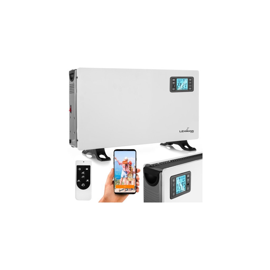 Volně stojící elektrický konvektorový ohřívač s termostatem, Wi-Fi připojením, dálkovým ovládáním a časovačem.