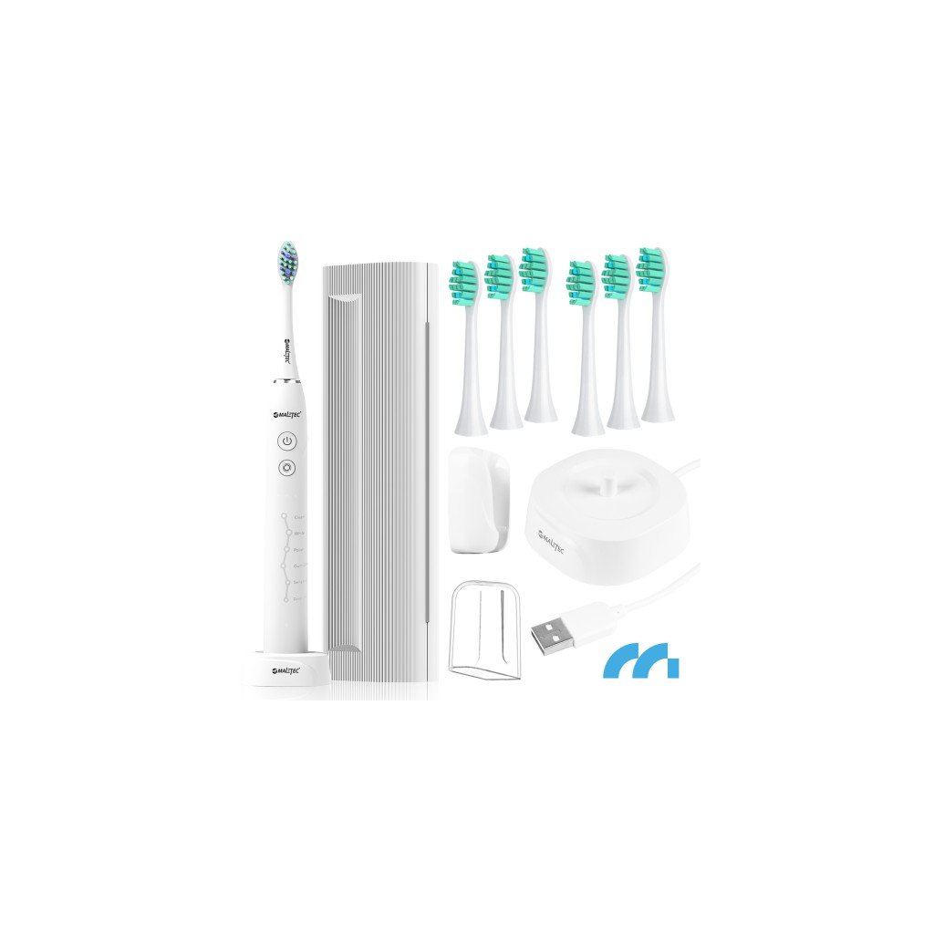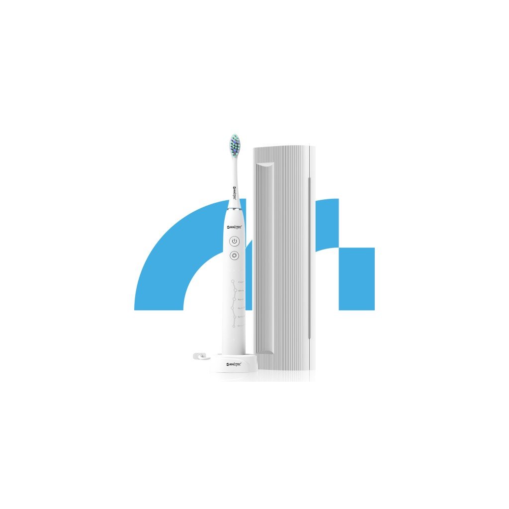Elektrický sonický kartáček v sadě s vyměnitelnými nástavci a praktickým přenosným pouzdrem.