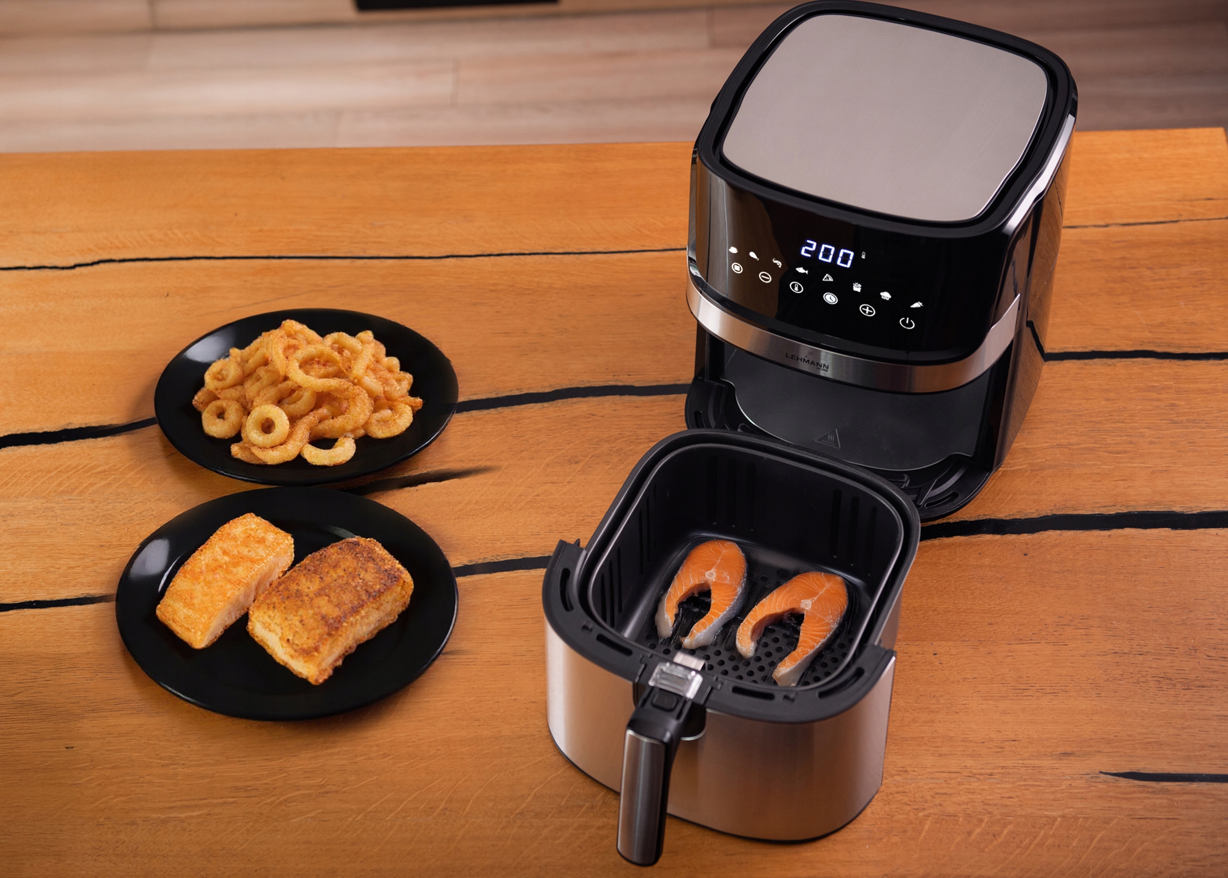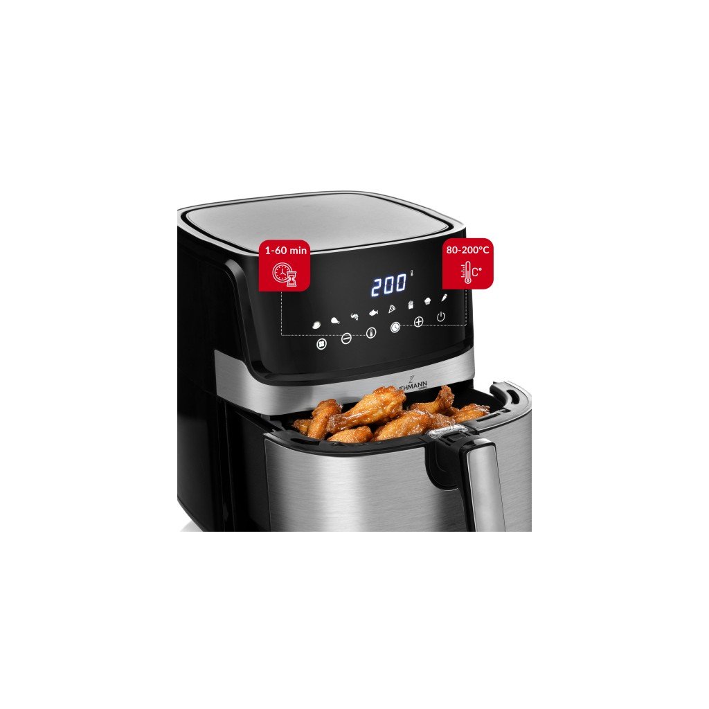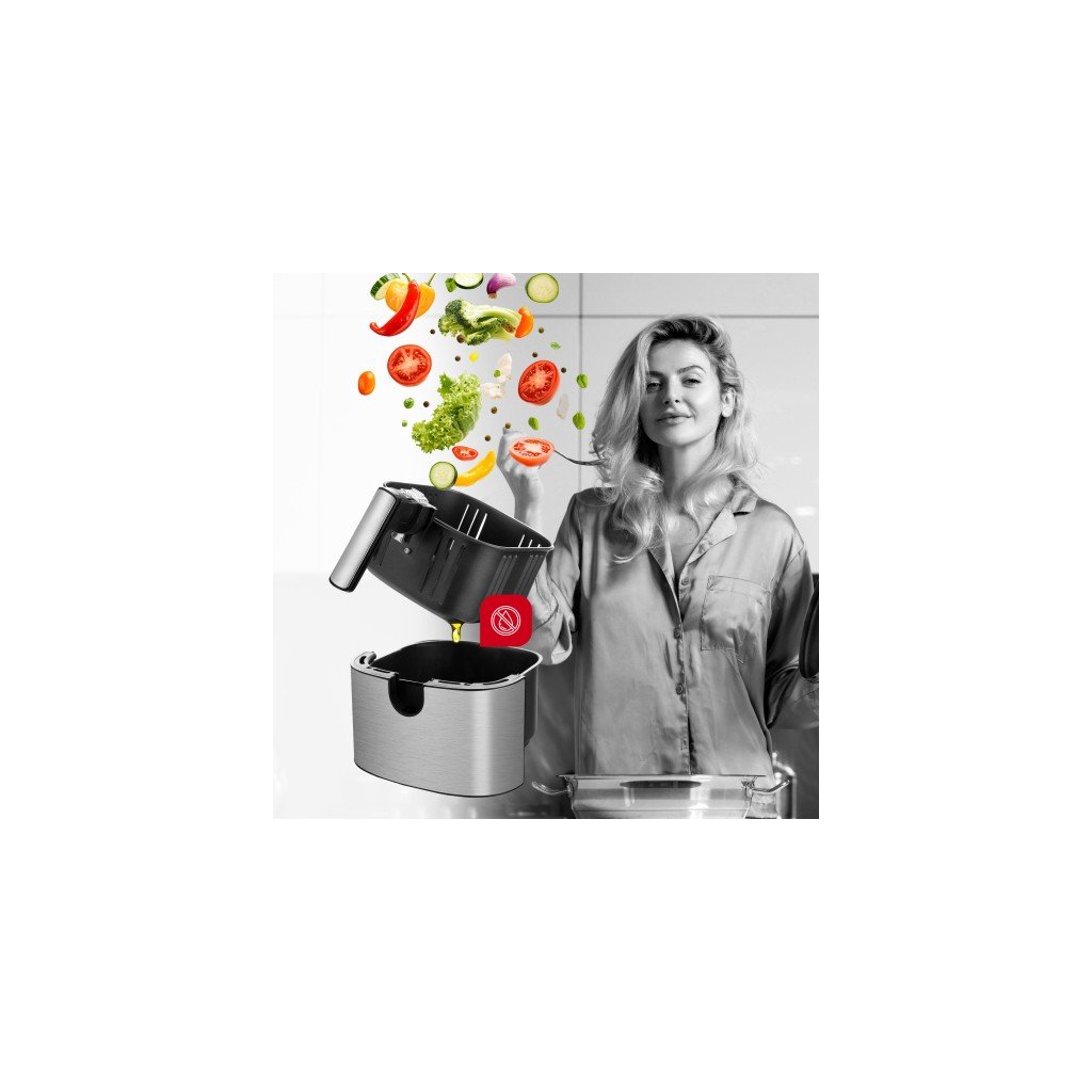 Rozsah 80 – 200 °C a časovač až na 60 minut umožňují přizpůsobit parametry každému pokrmu. Otevření zásuvky automaticky zastaví provoz zařízení, což zvyšuje bezpečnost obsluhy.