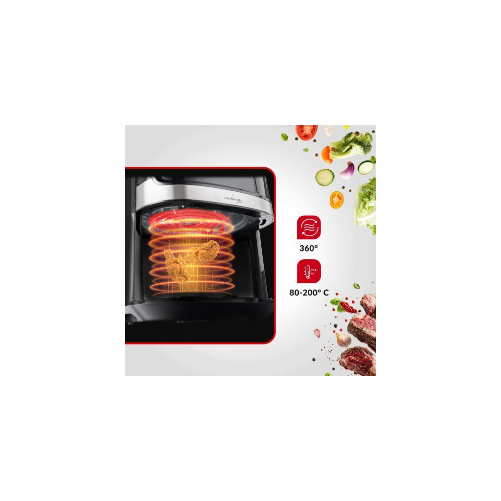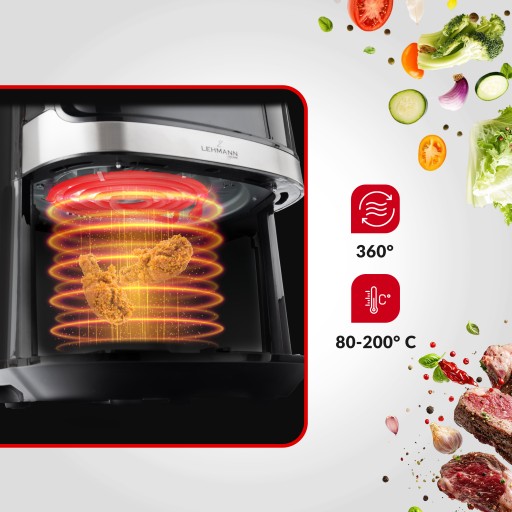 Optimalizovaná cirkulace vzduchu rovnoměrně distribuuje teplo po celé komoře. Pokrmy se pečou přesně ze všech stran, jsou zvenku křupavé a uvnitř měkké, bez použití oleje.