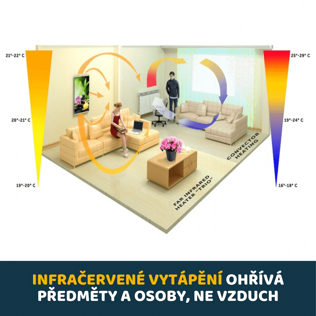 - Infračervené vytápění – ohřívá předměty a osoby, ne vzduch