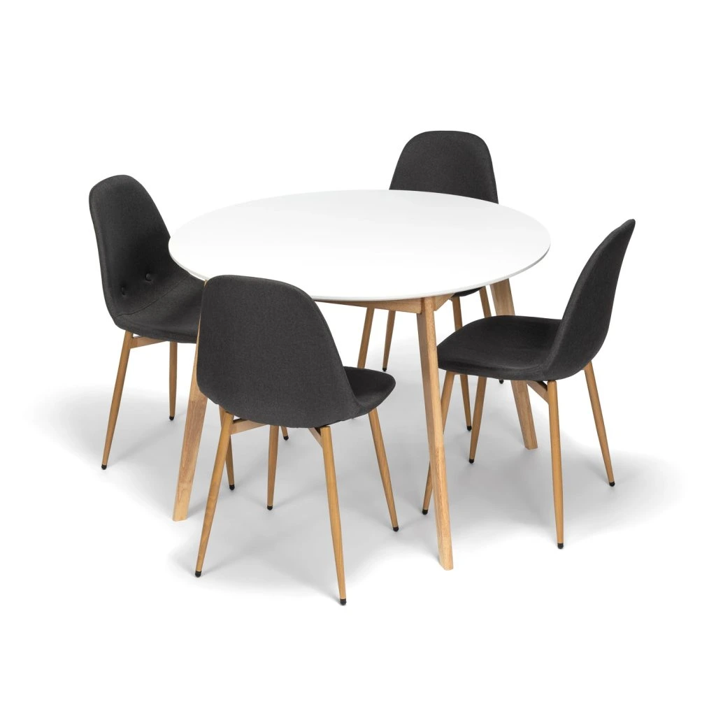 Jídelní sestavu tvoří Kulatý skandinávský jídelní stůl SCANDINAVIA 105 bílý a 4 Látkové jídelní židle MARIE tmavě šedá.