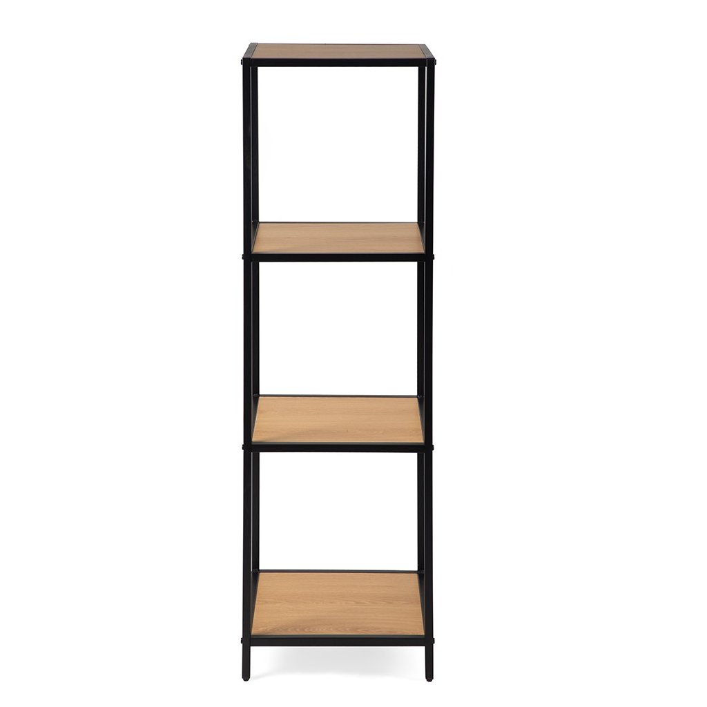 Praktický otevřený regál s kovovým rámem a čtyřmi policemi v dekoru přírodního dřeva nabízí funkční úložný prostor s odlehčeným vzhledem. Poskytuje místo pro knihy, dekorace nebo doplňky.