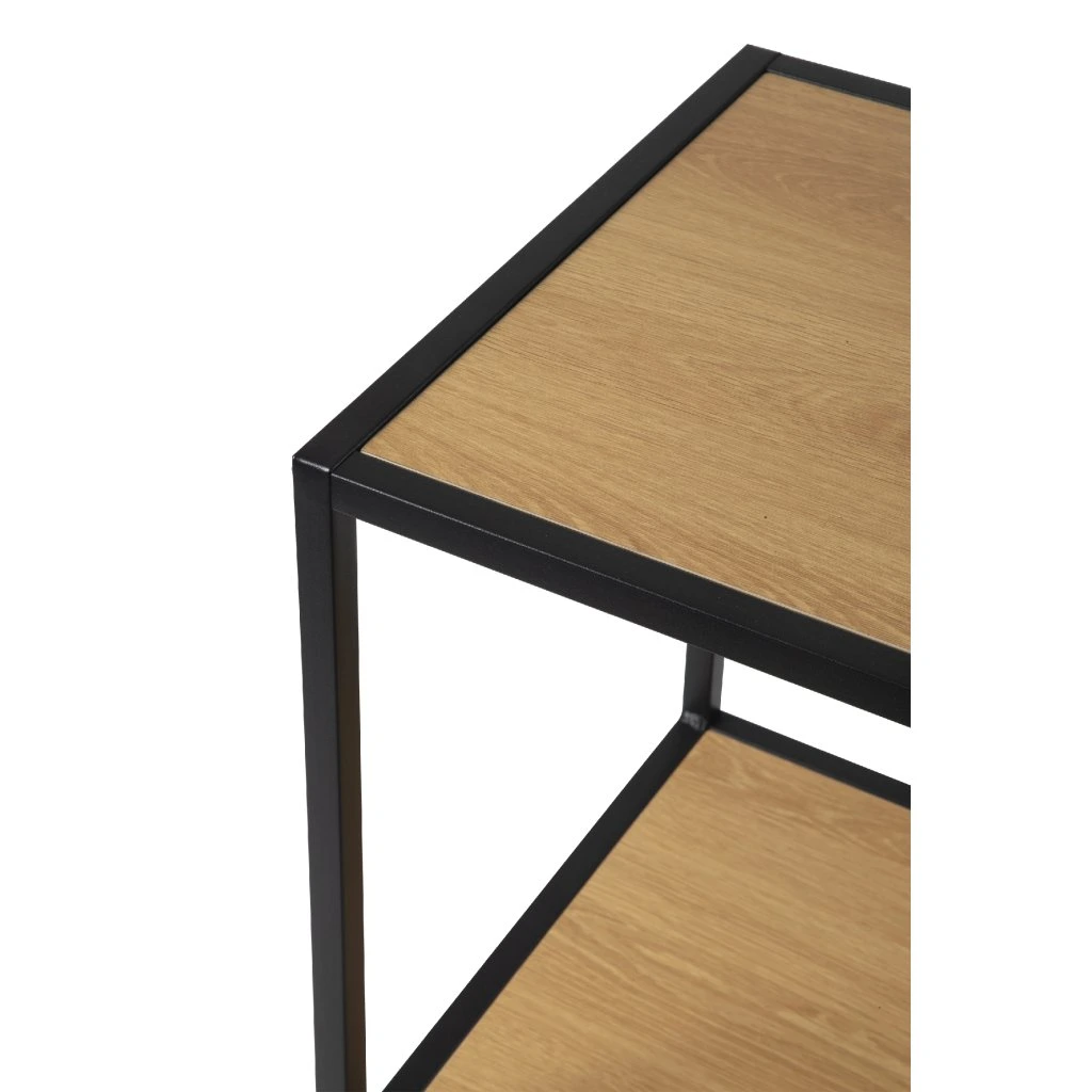 Černá kovová konstrukce zajišťuje stabilitu, zatímco laminované police jsou snadno udržovatelné a odolné vůči běžnému používání. Regál se hodí do obývacího pokoje, pracovny nebo vstupního prostoru. Určitě oceníte vzdušné otevřené provedení, které nebrání světlu.