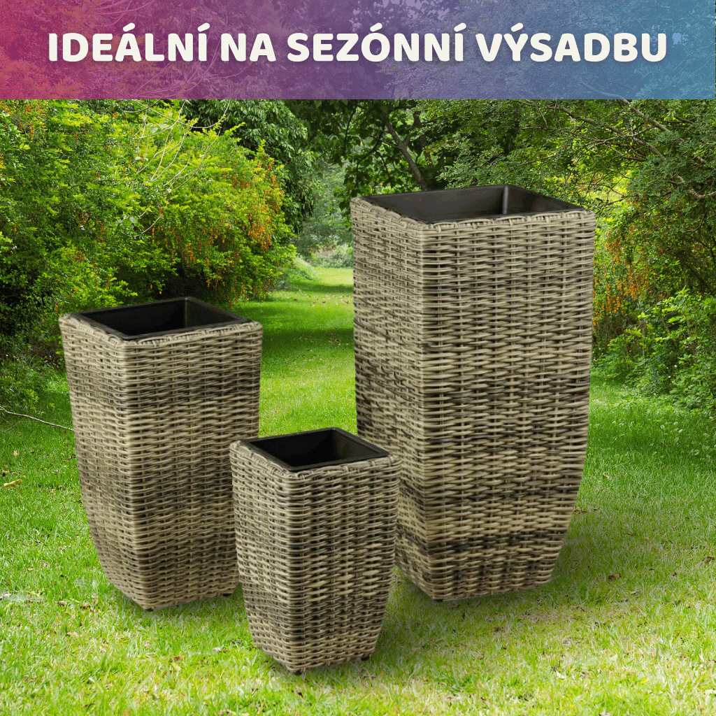 Kovová konstrukce květináčů je vypletena umělým ratanem v hnědé barvě.