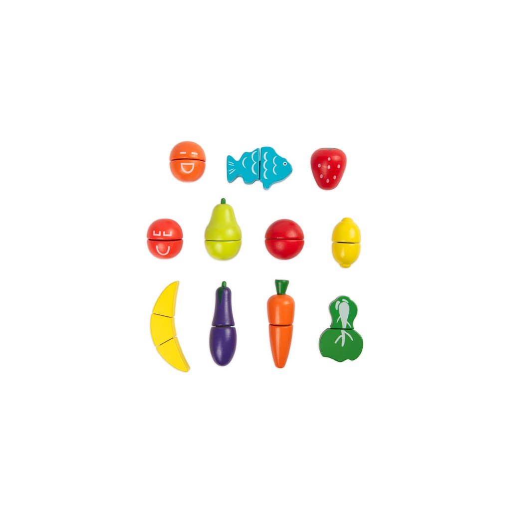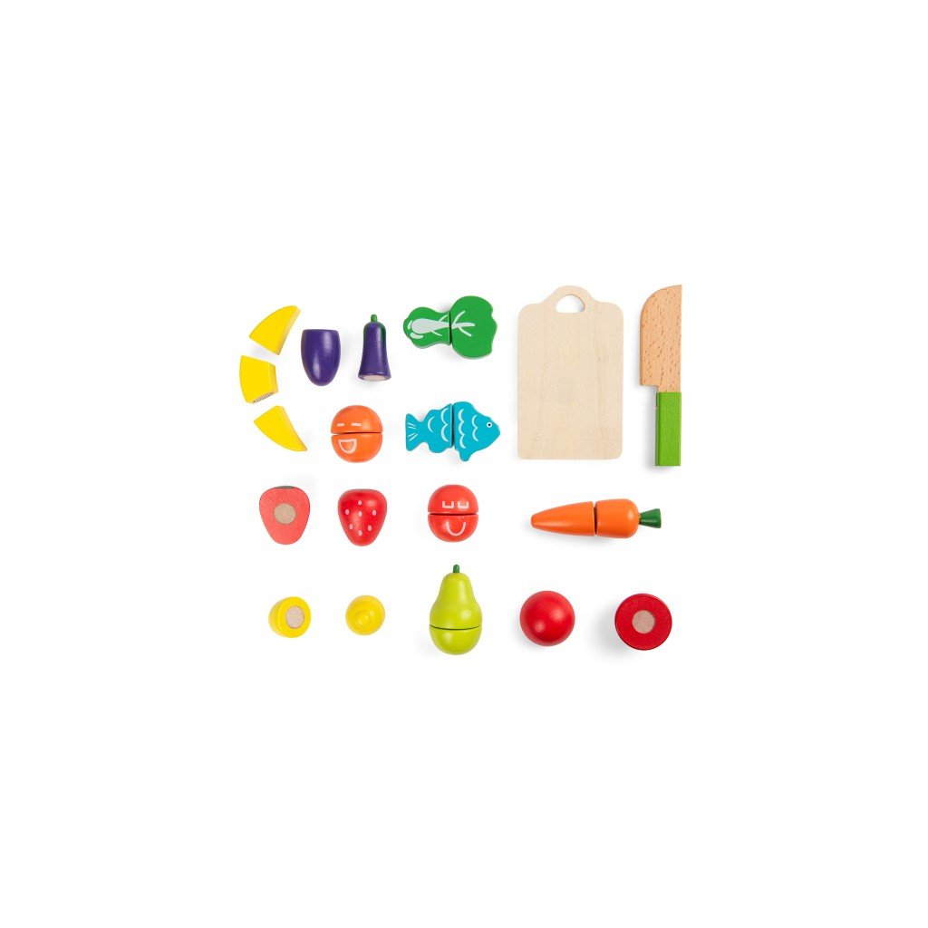 Potraviny se skládají ze dvou částí spojených pomocí suchých zipů, takže je lze snadno překrojit dřevěným nožem bezpečným pro dítě, který je součástí sady.