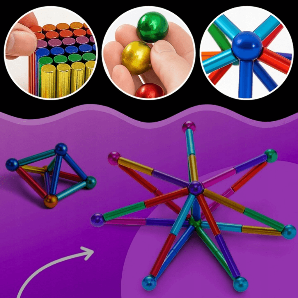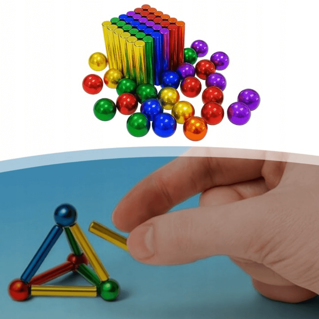 Díky barevným tyčinkám a ocelovým kuličkám snadno vytvoříte jednoduché i složité 2D a 3D konstrukce, které rozvíjejí fantazii i jemnou motoriku.