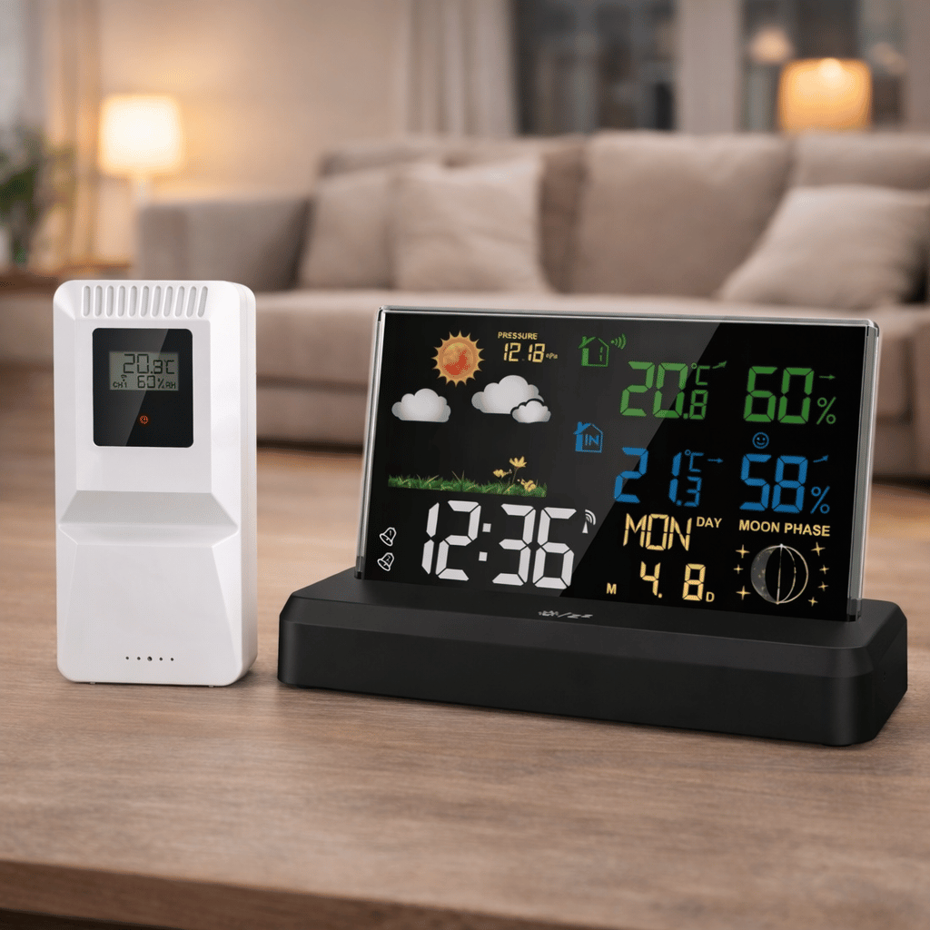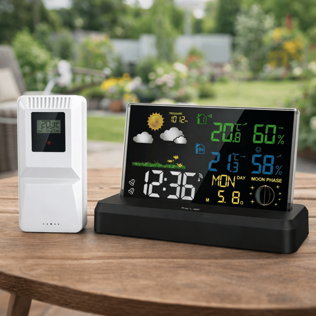 Sledujte teplotu, vlhkost a předpověď počasí na přehledném barevném displeji.