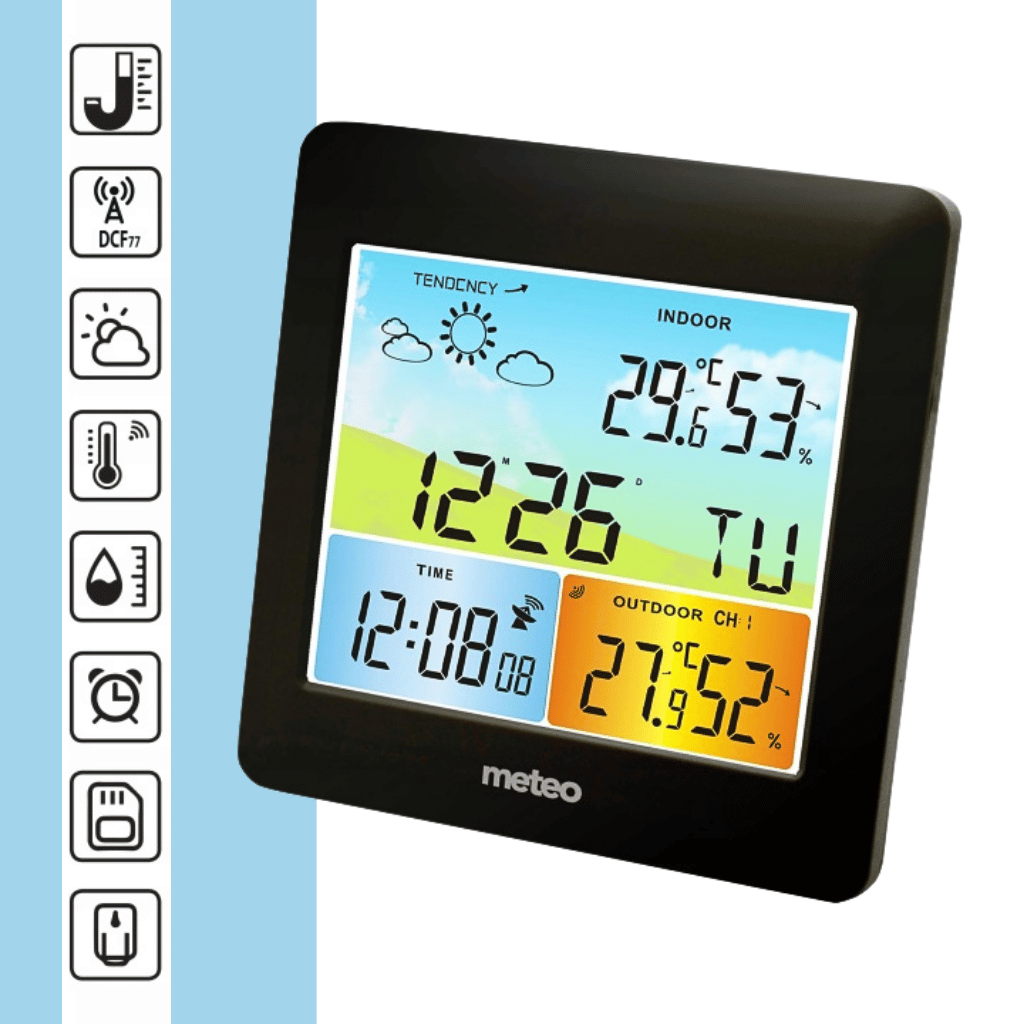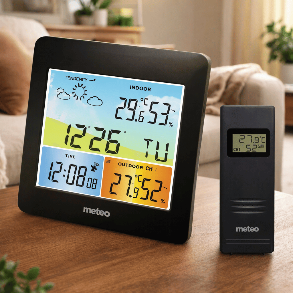 - Bezdrátové měření teploty uvnitř i venku (-20 °C až +50 °C venkovní rozsah)