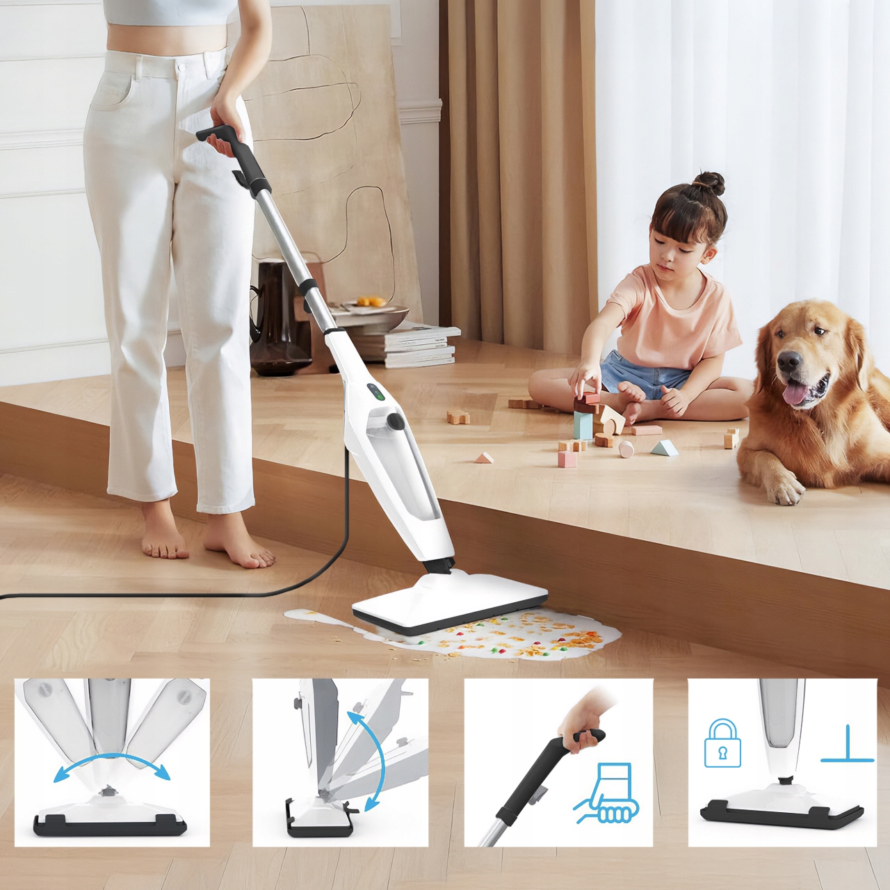 Díky lehké konstrukci a pohyblivé hlavě se mop snadno dostane i do těžko přístupných míst – i pod nábytek a do rohů.