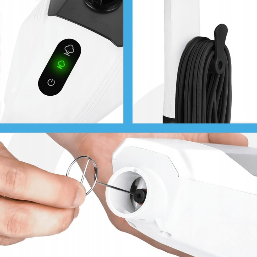 Držák lze odpojit, což usnadňuje skladování zařízení ve svislé poloze. Dlouhý napájecí kabel (7 m) můžete pohodlně navinout na úchytky umístěné na zadní straně čističe.