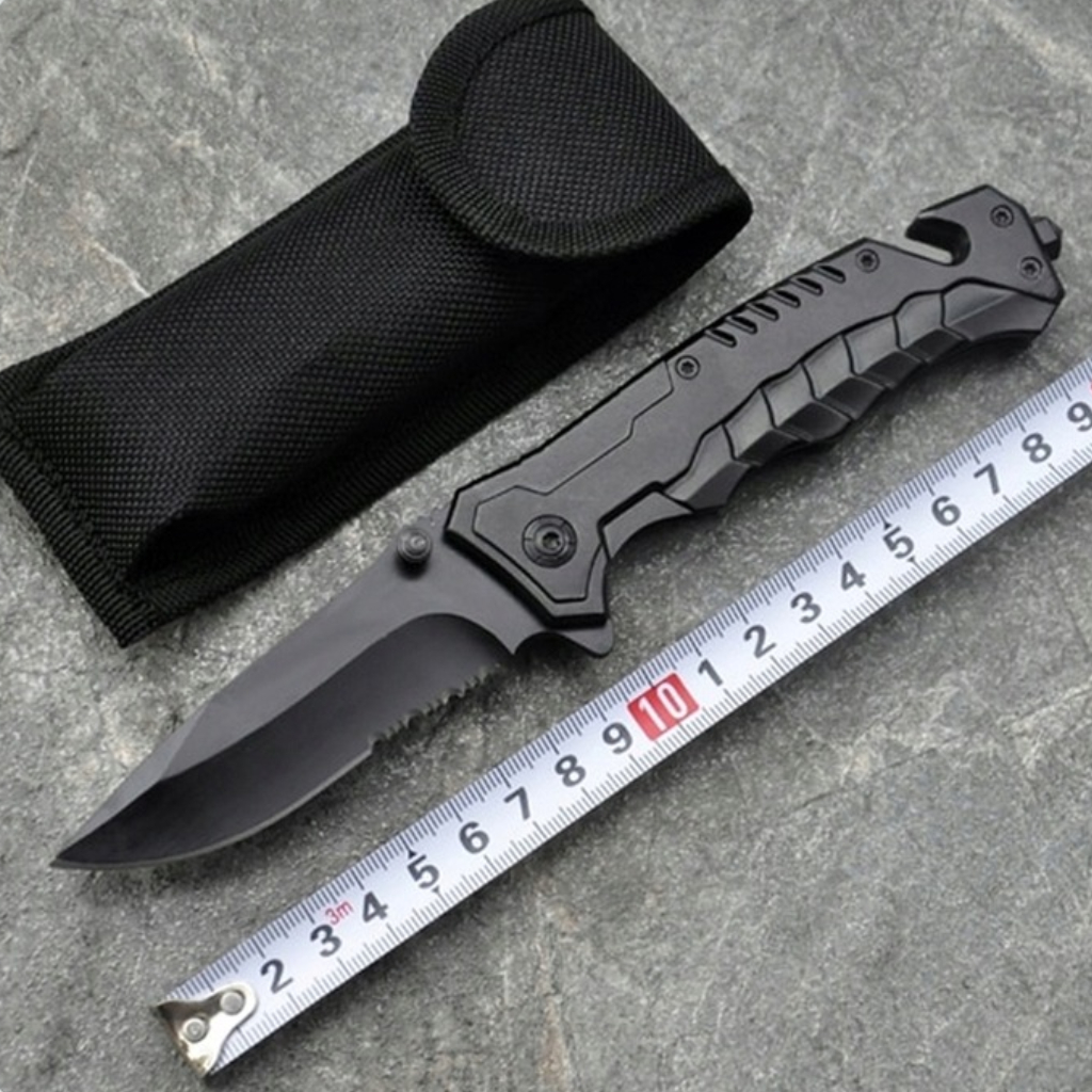 Ve výbavě je lehký skládací nůž s rozřezávacím hákem, otvírákem na láhve, pilkou a rozbíječem.