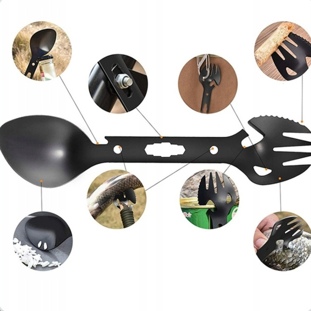 Praktická lžíce a vidlička v jednom má i další přednosti: otvírák na láhve, klíč na uzávěry, otvírák na konzervy, škrabka na ryby a dokonce i harpuna!