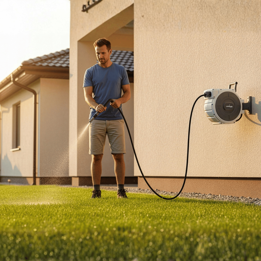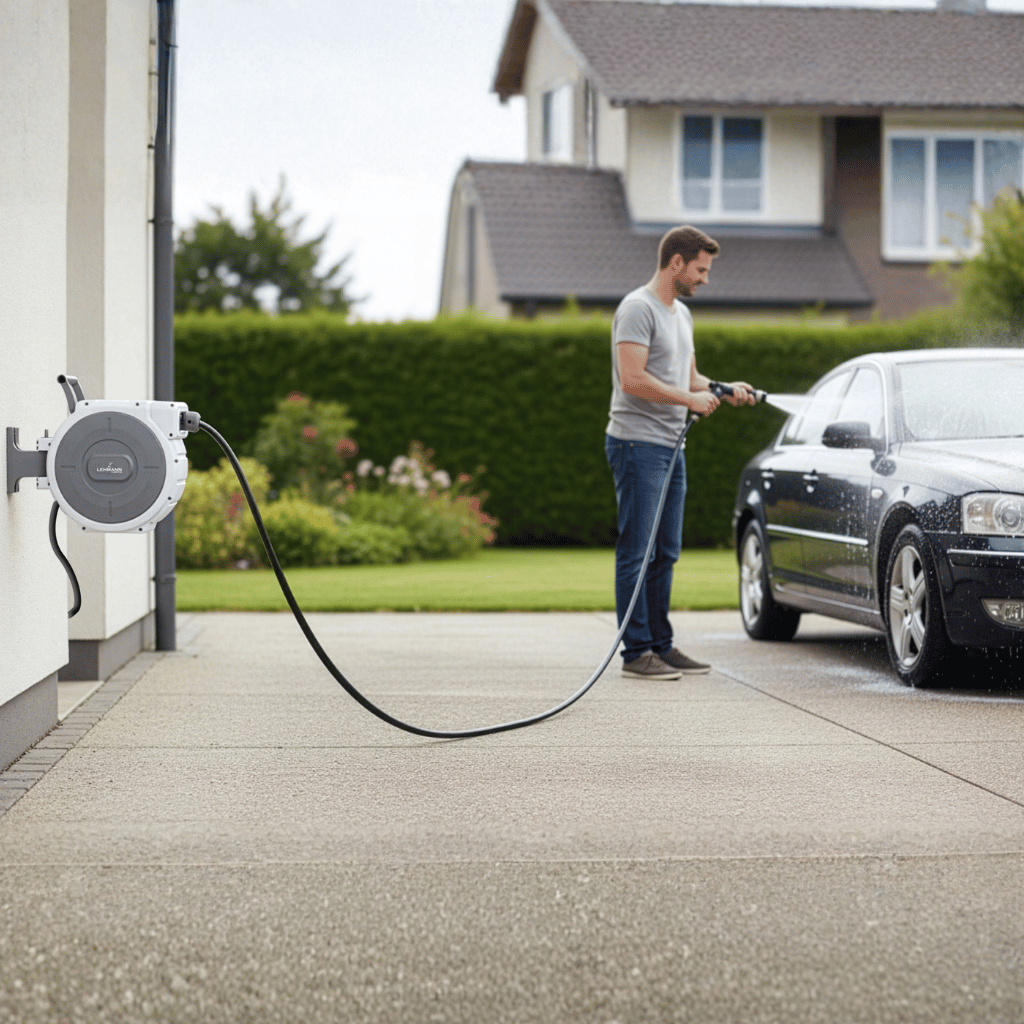 Stačí jeden pohyb a hadice se sama bezpečně navine zpět. Díky dlouhému dosahu, otočnému držáku a kvalitní konstrukci je ideální pro každodenní použití.