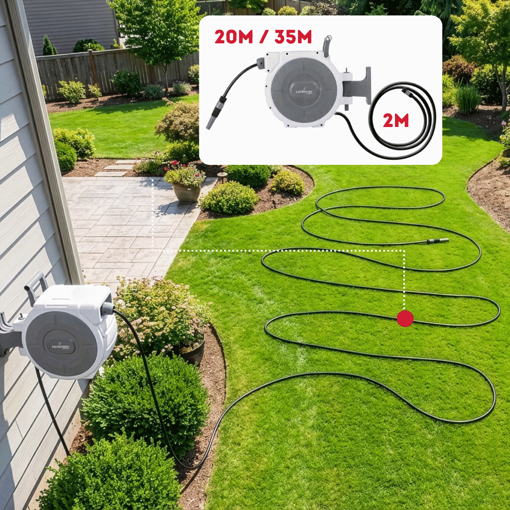 Naviják je dostupný ve dvou variantách – s hadicí 20 m + 2 m přívodní nebo delší 35 m + 2 m, takže si snadno vyberete ideální dosah pro svou zahradu.