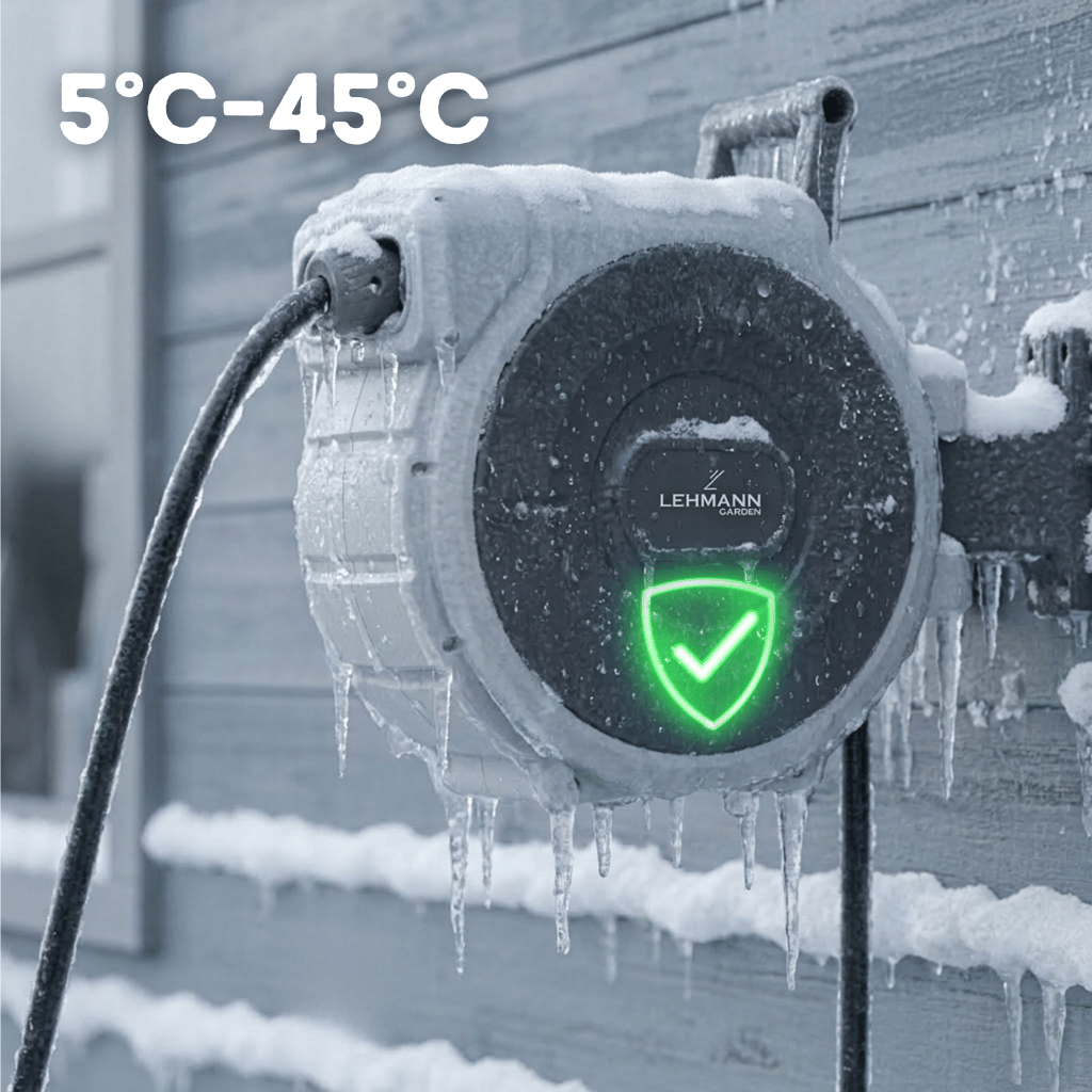 Praktický otočný držák (0–180°) zajišťuje maximální volnost pohybu, zatímco zpomalené navíjení chrání vás i okolí před prudkým návratem hadice.