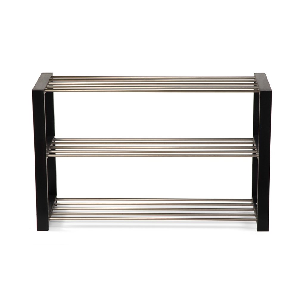 Botník s ocelovou konstrukcí v černé barvě a a ocelovými tyčemi ve stříbrné barvě.