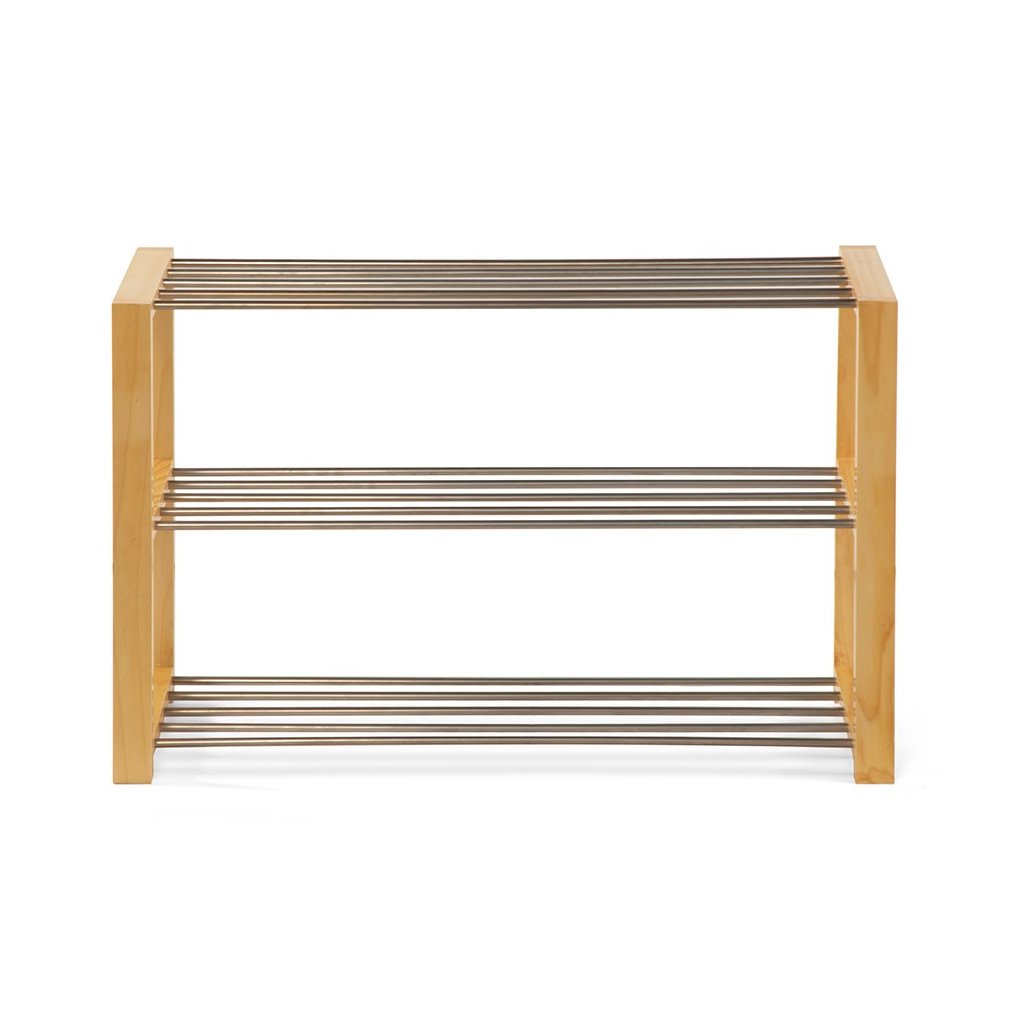 Botník s ocelovou konstrukcí v dekoru dřeva a ocelovými tyčemi ve stříbrné barvě.