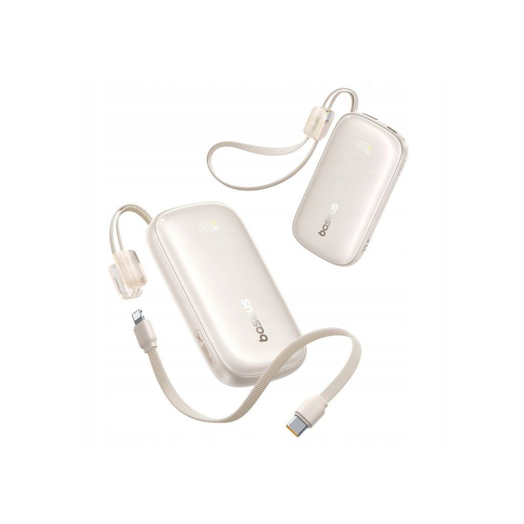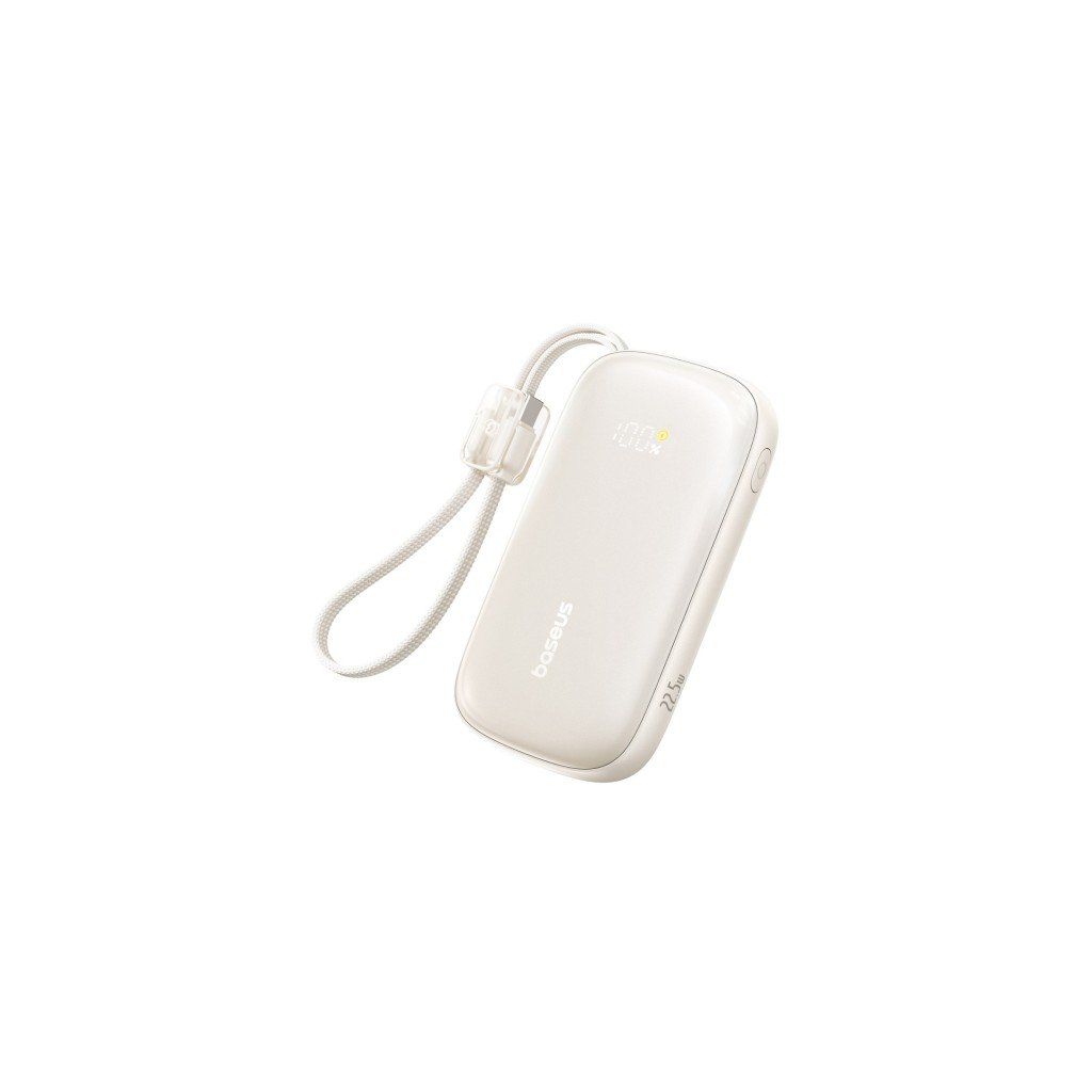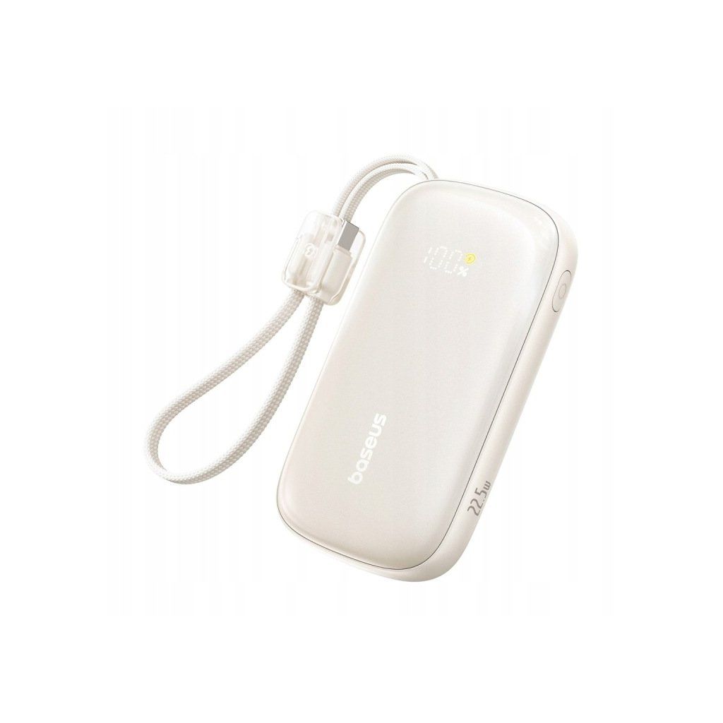 Lehká a elegantní powerbanka 10 000 mAh s možností rychlého nabíjení 22,5 W a kabelem USB-C ↔ Lightning, který slouží zároveň jako poutko pro nošení.