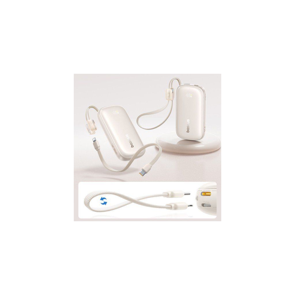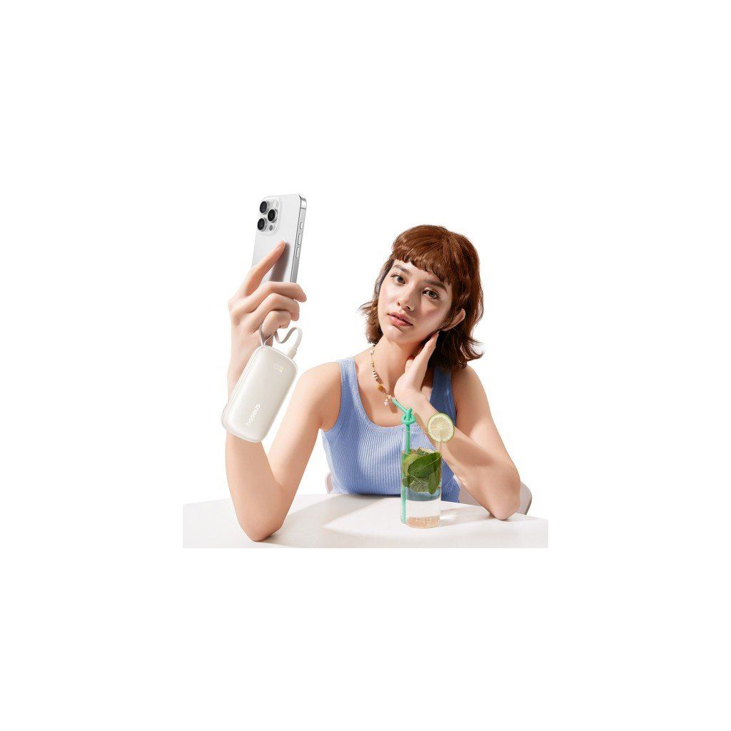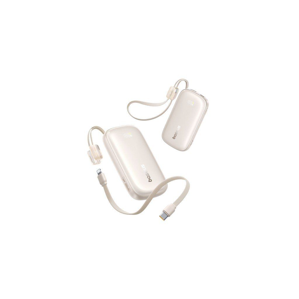 Lehká a elegantní powerbanka 10 000 mAh s možností rychlého nabíjení 22,5 W a kabelem USB-C ↔ Lightning, který slouží zároveň jako poutko pro nošení.