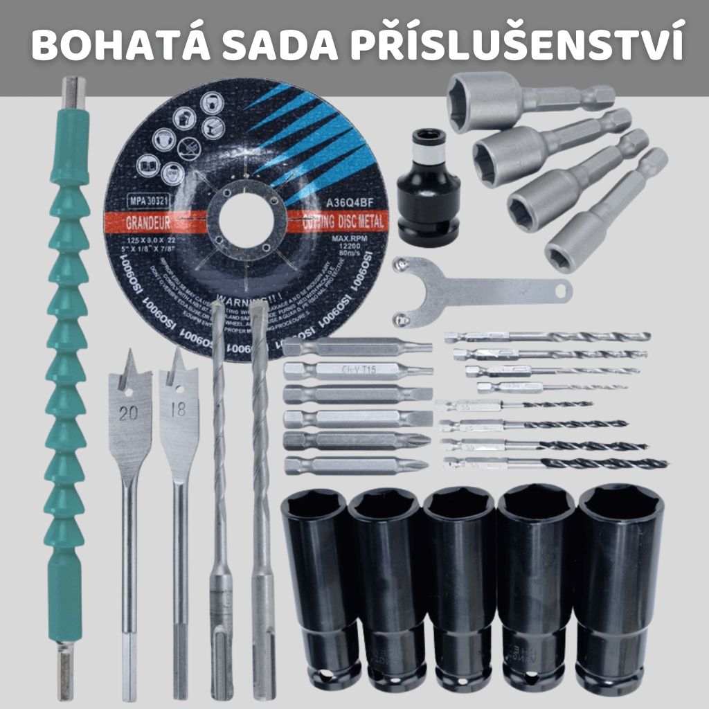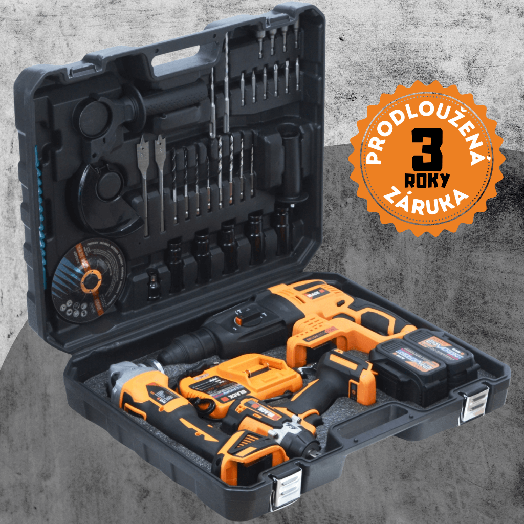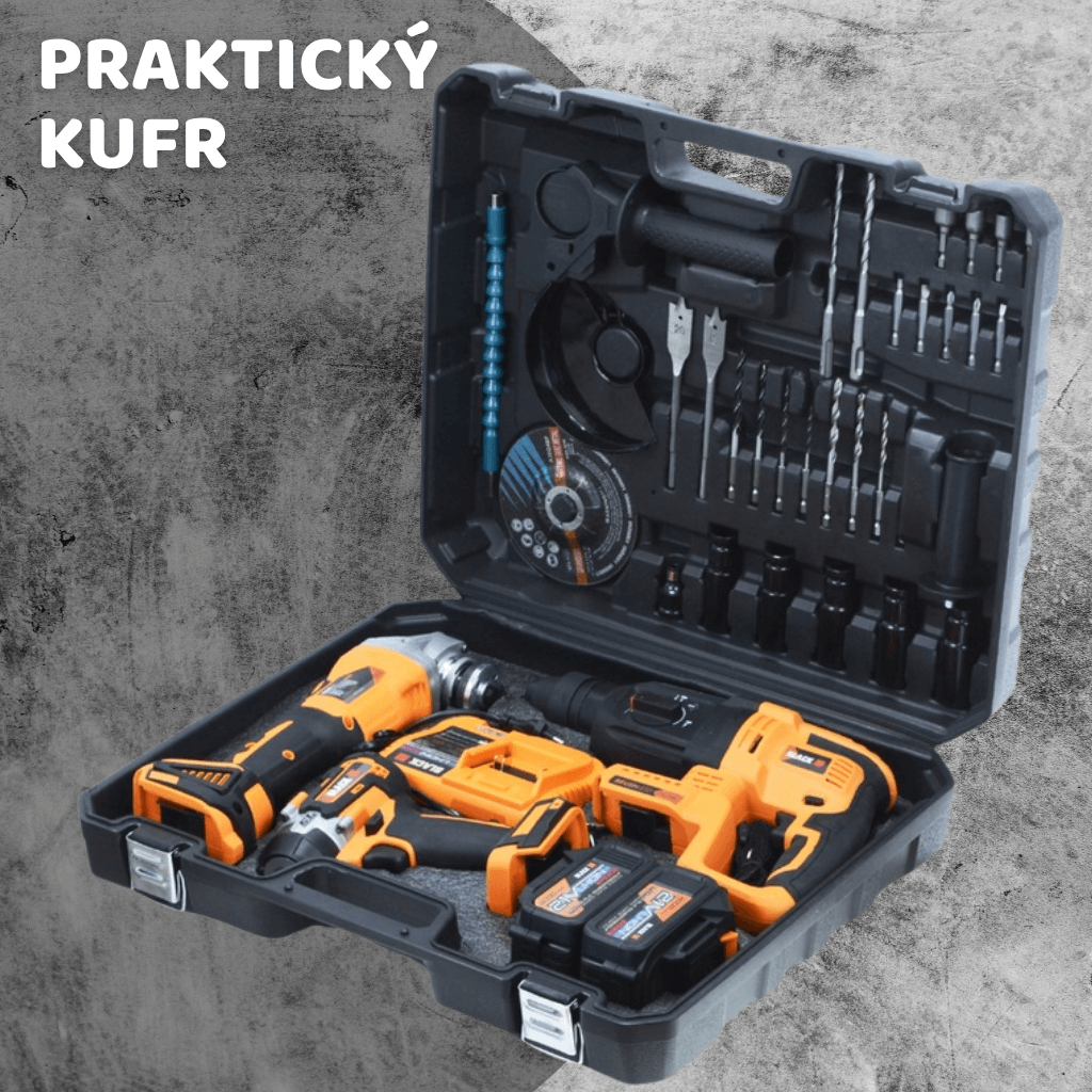 - Obsahuje aku úhlovou brusku, rázový utahovák a příklepové/vrtací kladivo