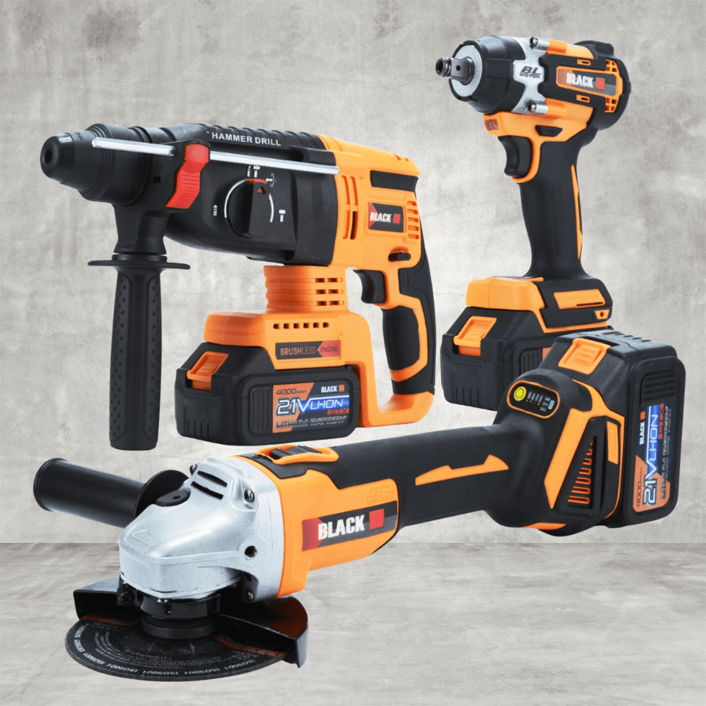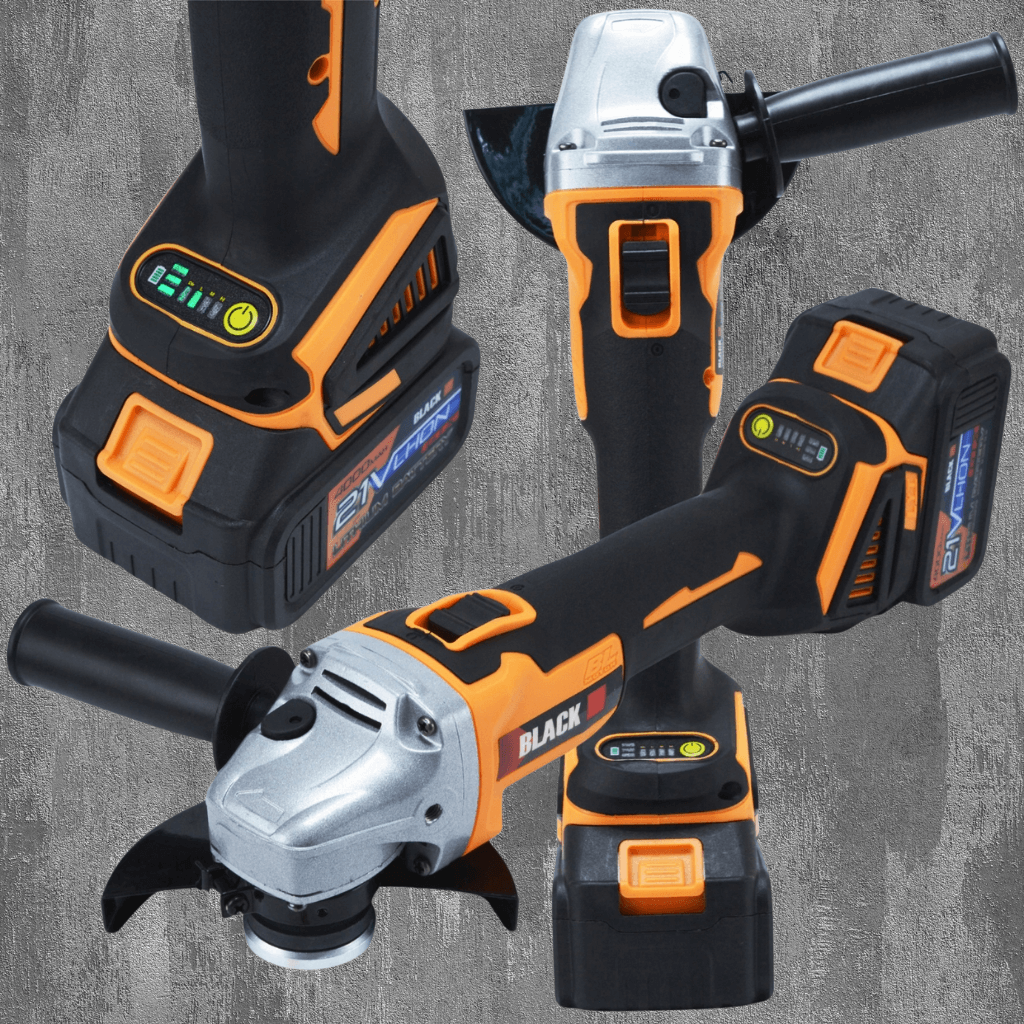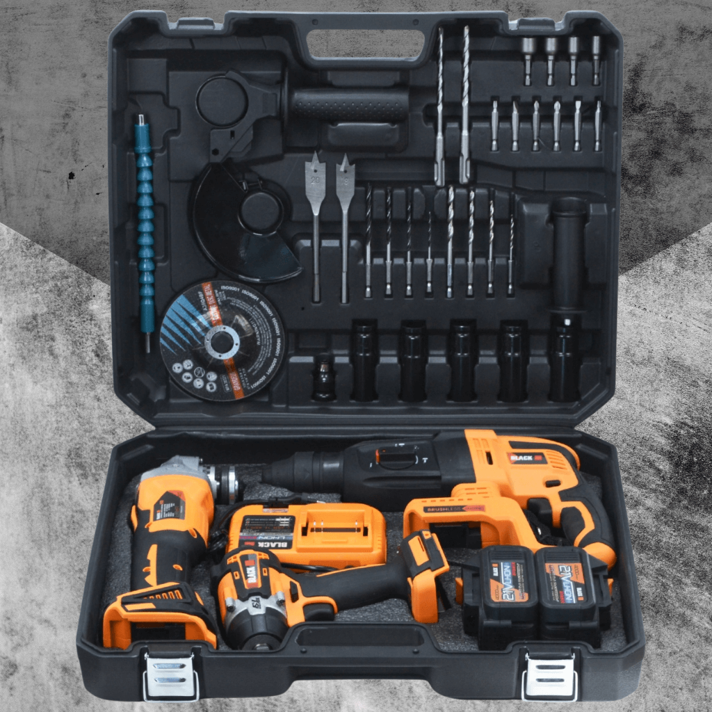 - Obsahuje aku úhlovou brusku, rázový utahovák a příklepové/vrtací kladivo