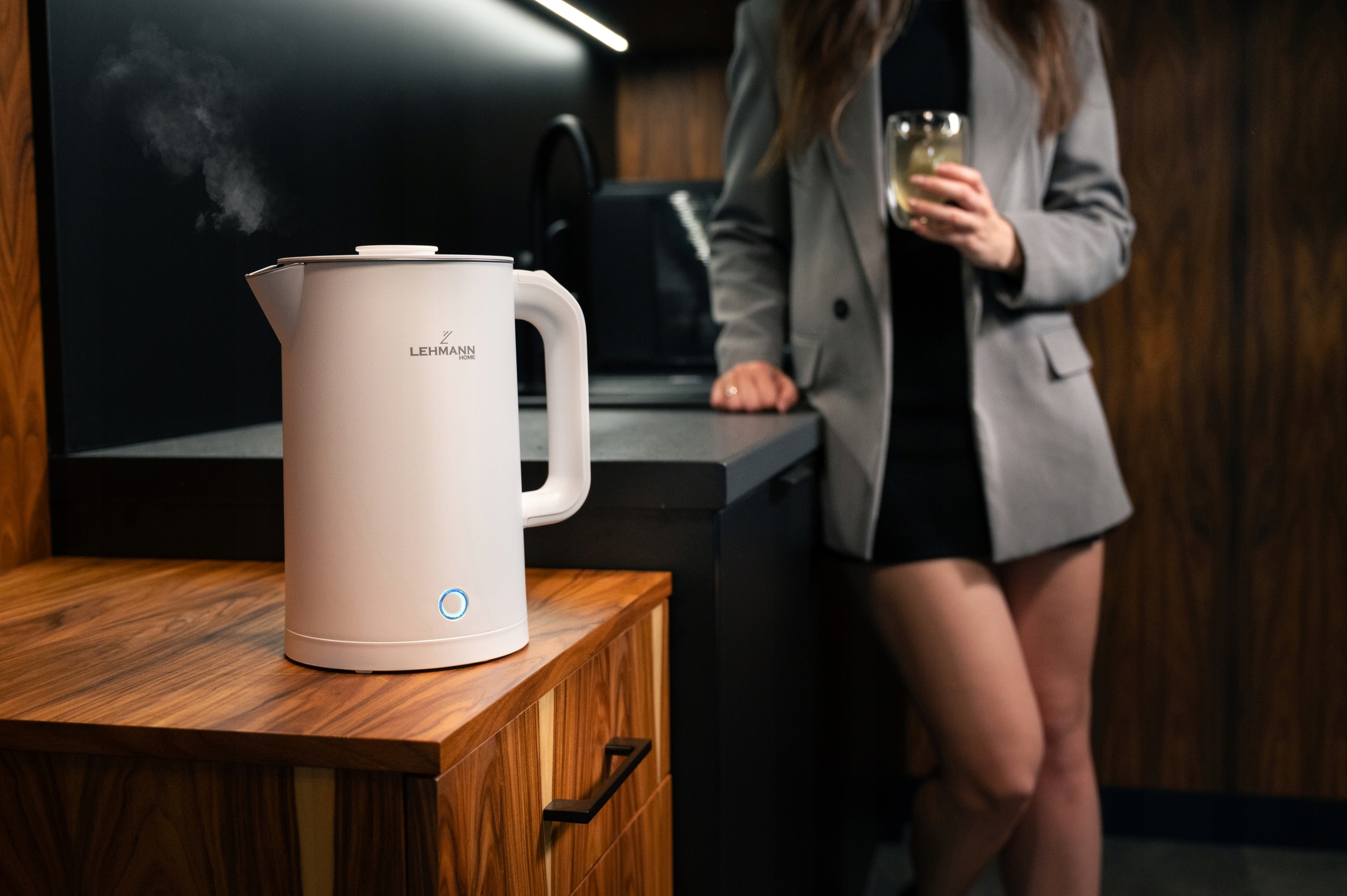 - LED kontrolka (modrá) – stylové podsvícení signalizuje, že zařízení pracuje. Světlo po ukončení varu zhasne, což usnadňuje kontrolu provozu.