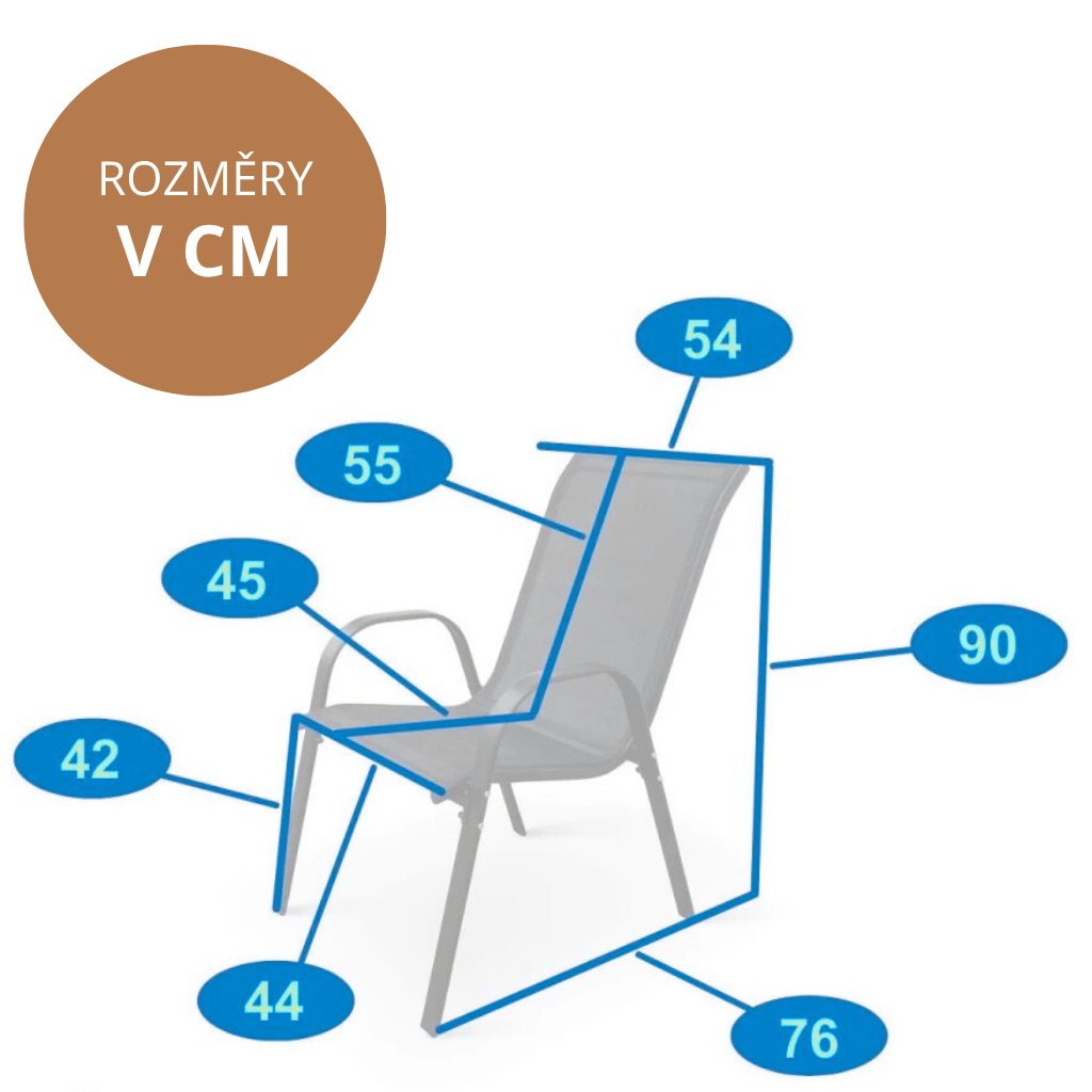 Židle disponuje opěrkou zad o délce 55 cm. Sedák o rozměrech 45 cm x 44 cm (Hloubka x Šířka) ve výšce 42 cm od země.