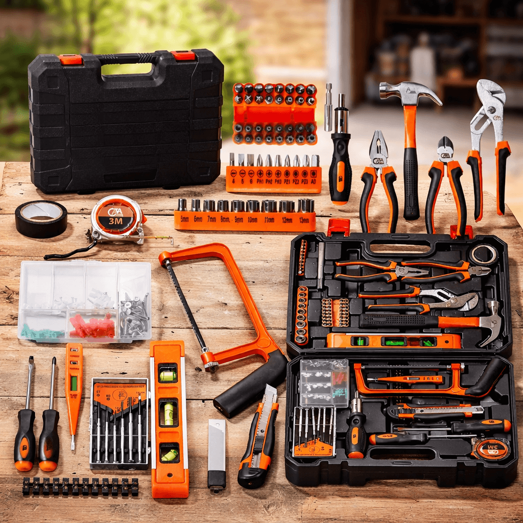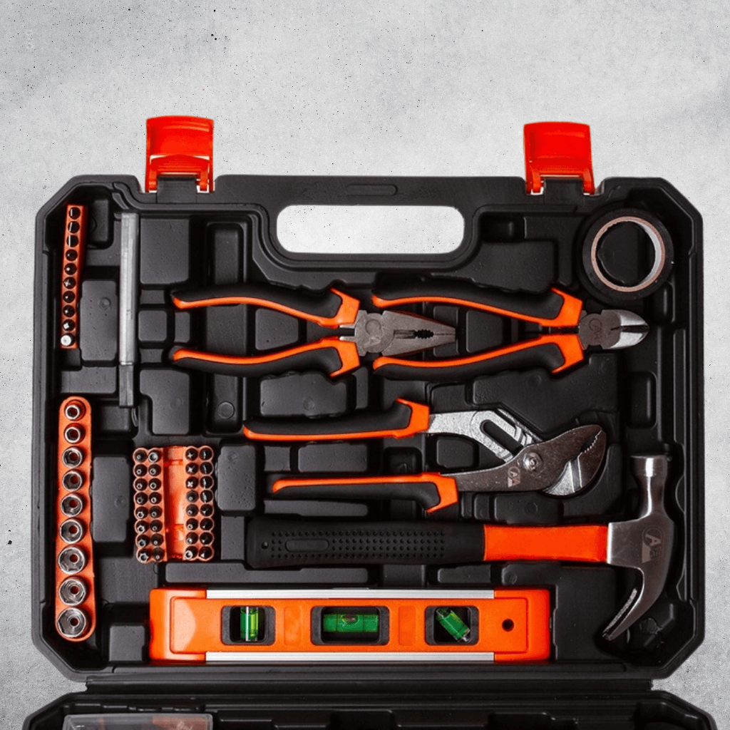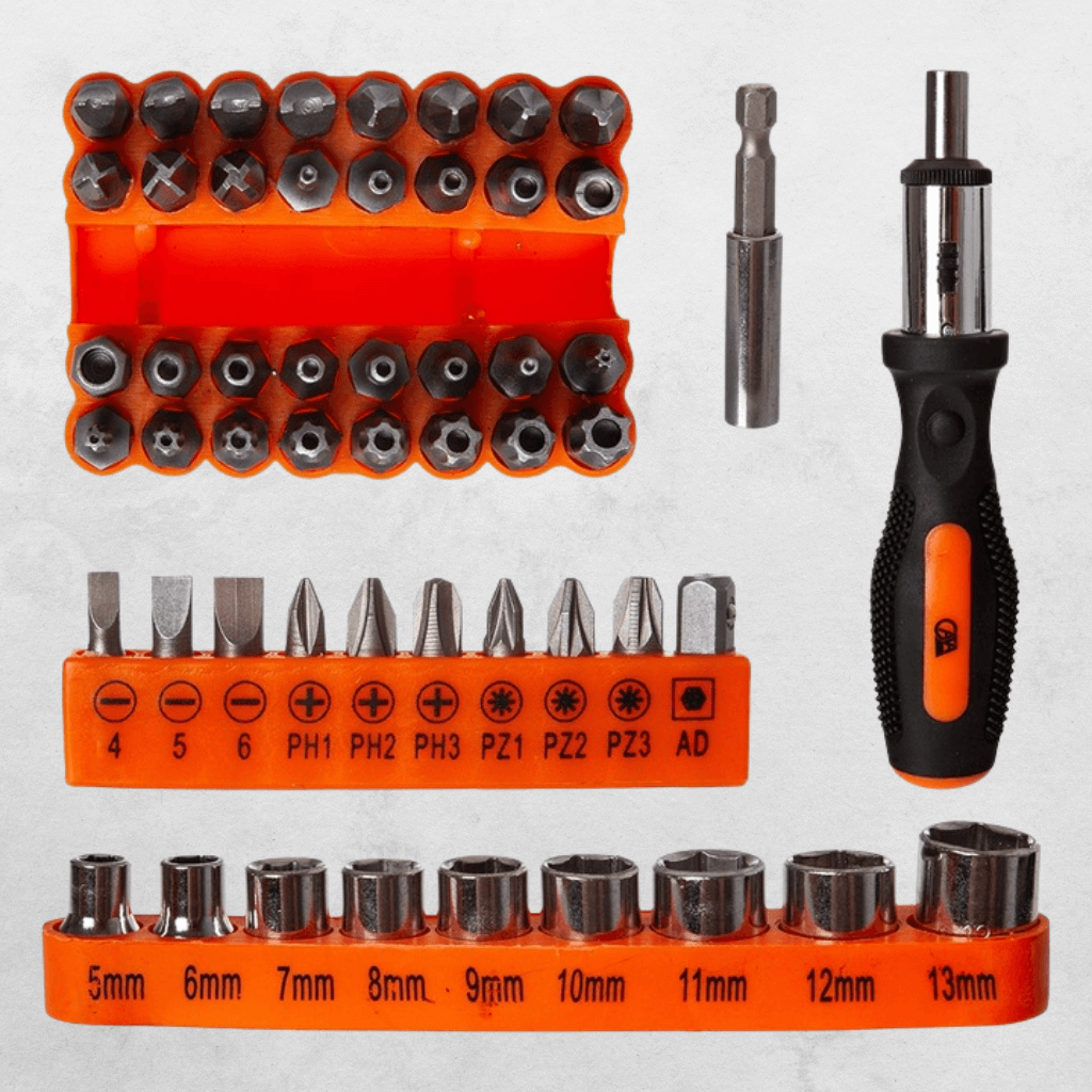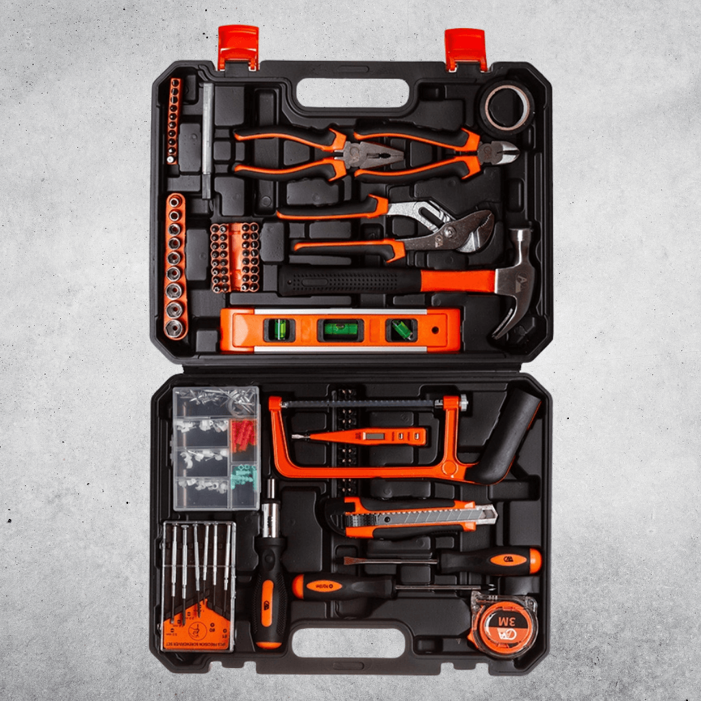 - Široká škála nástrojů: ráčna 1/4", nástrčné hlavice, šroubováky, bity, kleště, imbusy, kladivo, nůž, mini pila, vodováha, svinovací metr a další