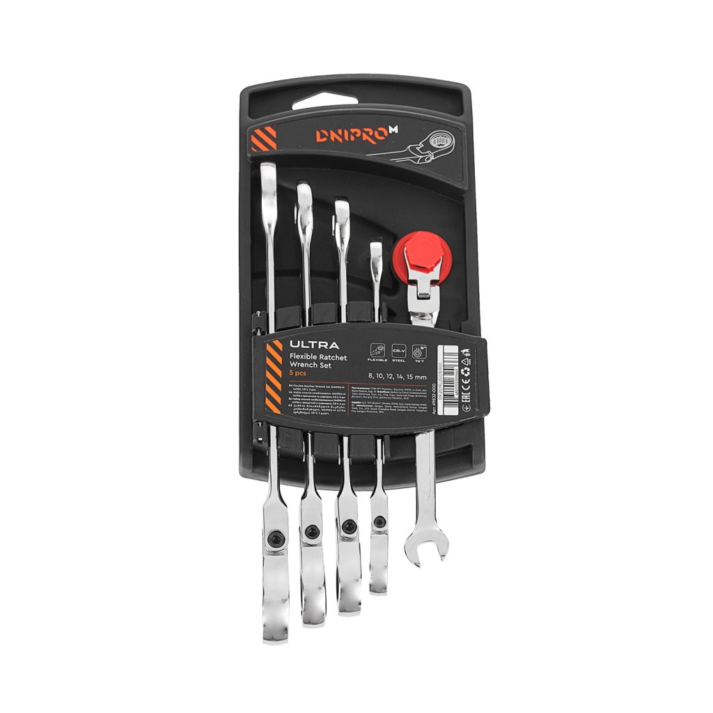 Sada očkoplochých klíčů s ráčnou a otočným kloubem Dnipro-M Ultra je určena pro kvalitní provádění montážních a zámečnických prací - vyšroubování a zašroubování šroubových spojů.Speciální funkce