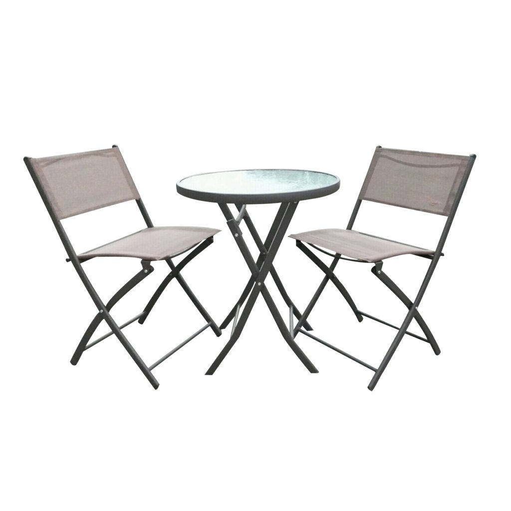 Skladá sa zo stabilného stolíka s elegantnou doskou z tvrdeného skla a kovovou konštrukciou, ktoré dopĺňajú dve stoličky vyrobené rovnako z oceli.