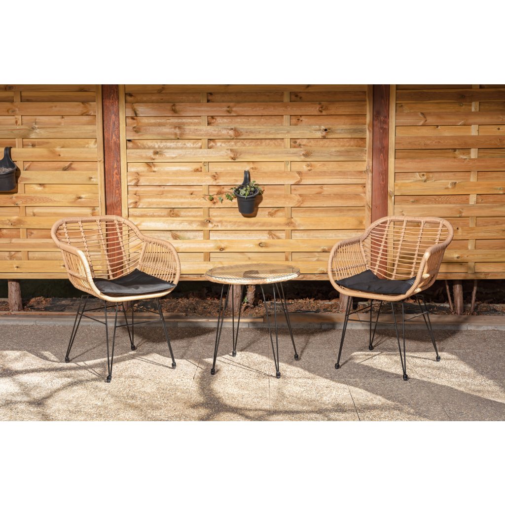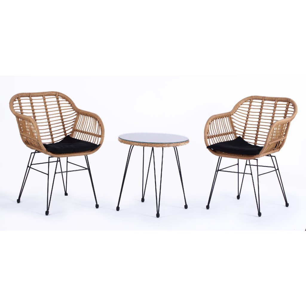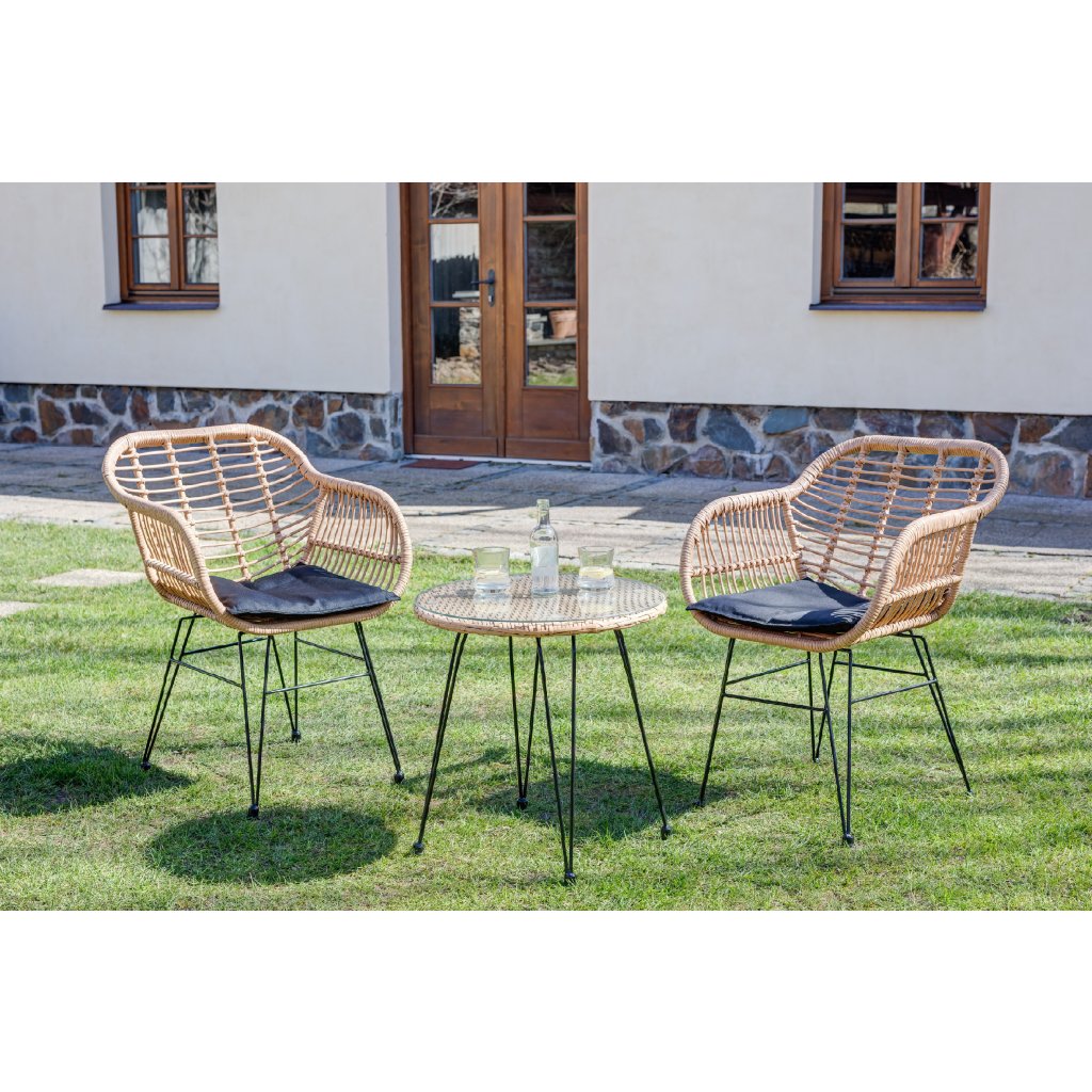 Elegantný set dvoch kresiel a stolíka skvele doplní čítací kútik v obývačke alebo posedenie s kávou na terase. Jednotný dizajn uľahčí prácu pri plánovaní interiéru a kombinácia čiernej farby so svetlým ratanom vytvára moderný vzhľad, ktorý vyzerá skvele jednoducho všade.